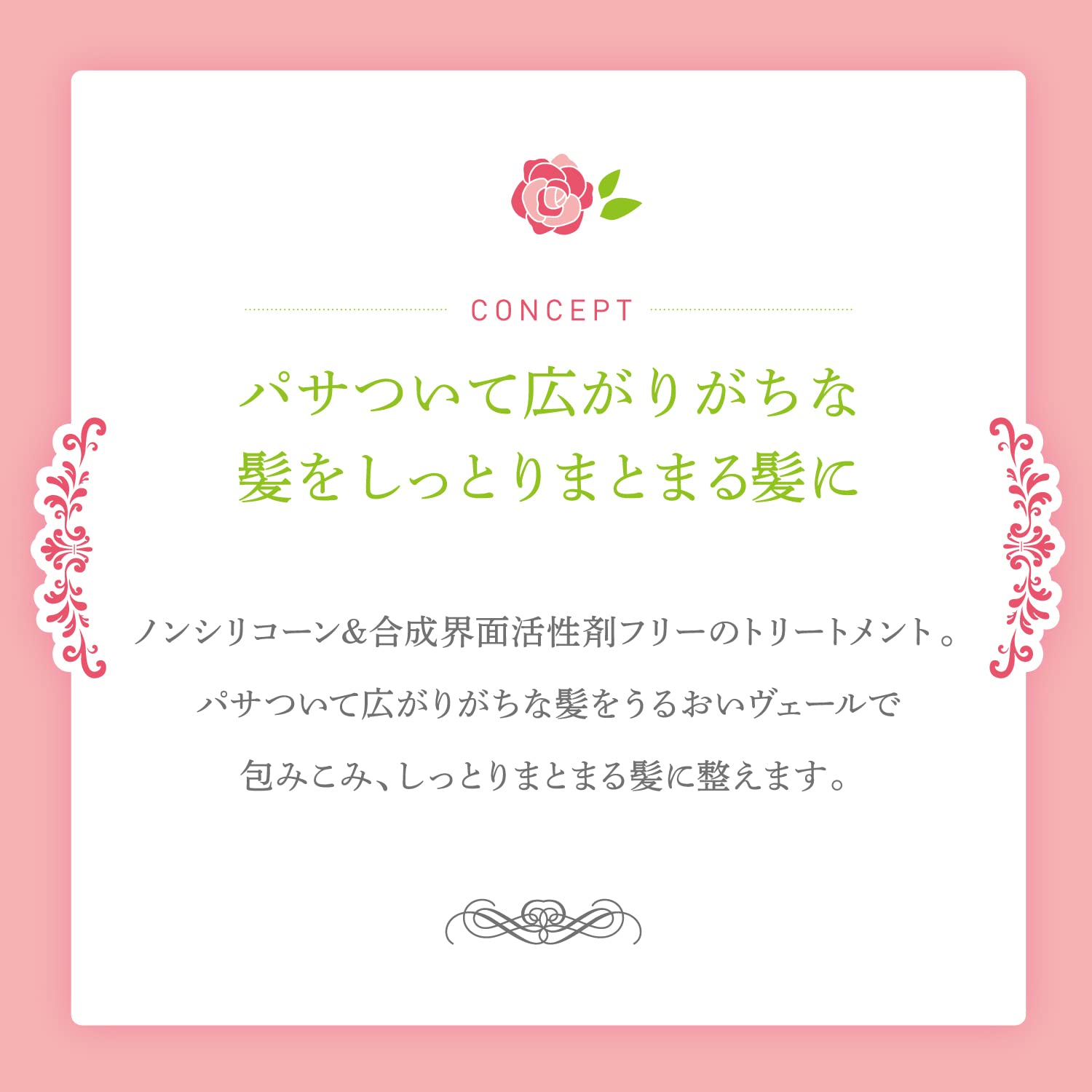 パサついて広がりがちな髪をうるおいヴェールで包みこみ、しっとり、まとまる髪に整えるトリートメントです。