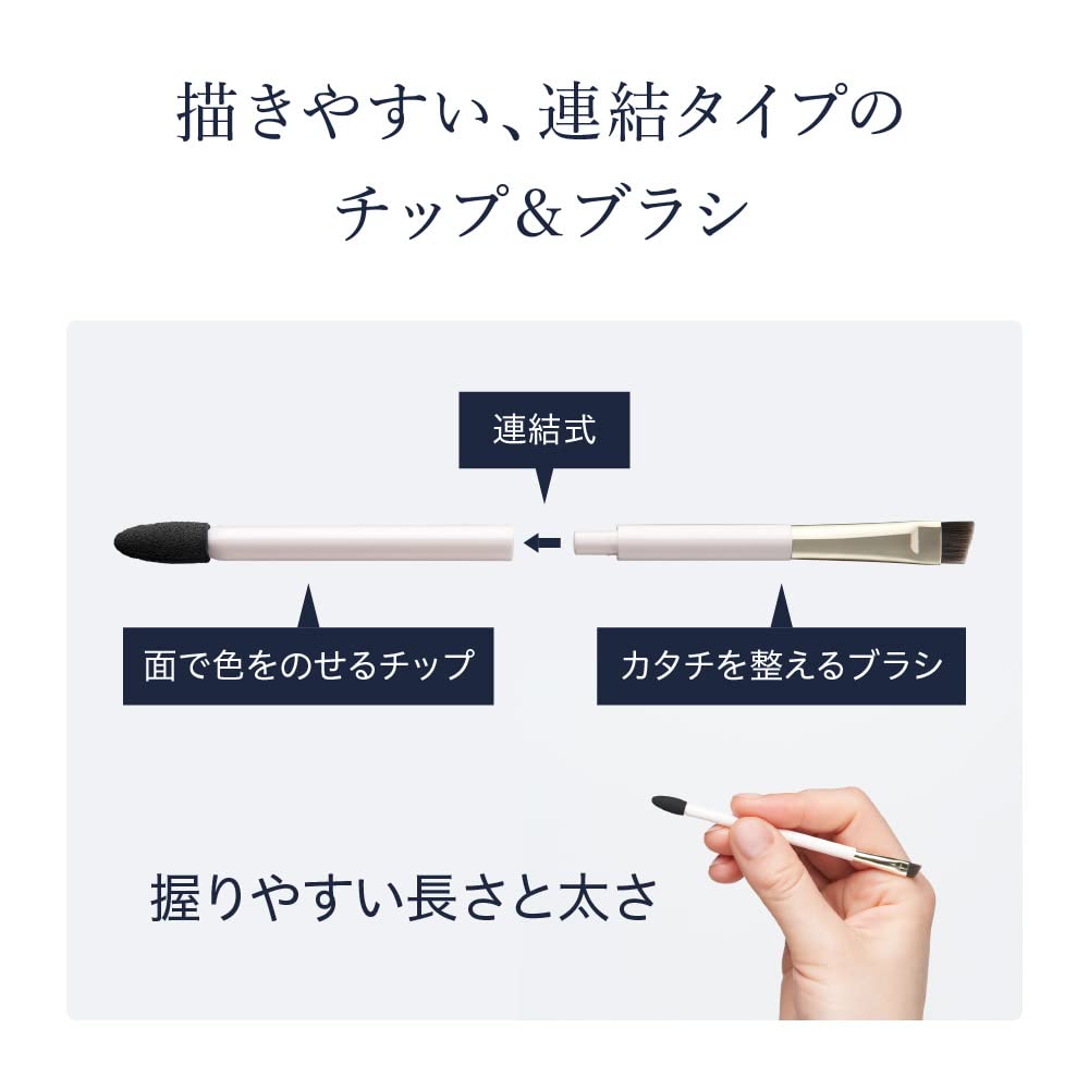<ご使用方法> 〇ブラシとチップを連結させてご使用ください。 〇薄い色のパウダーをチップに取り、眉頭から眉山に向かって優しく塗り広げます。 〇濃い色のパウダーをブラシに少量取り、眉山から眉尻にかけてラインを描きます。濃く色が付いたところはブラシでぼかしてください。 〇色が濃いと感じる時は、ブラシにパウダーをとった後、一度手の甲などで、調節してください。 〇混ぜて使うことで好みの色の濃さに調節ができます。