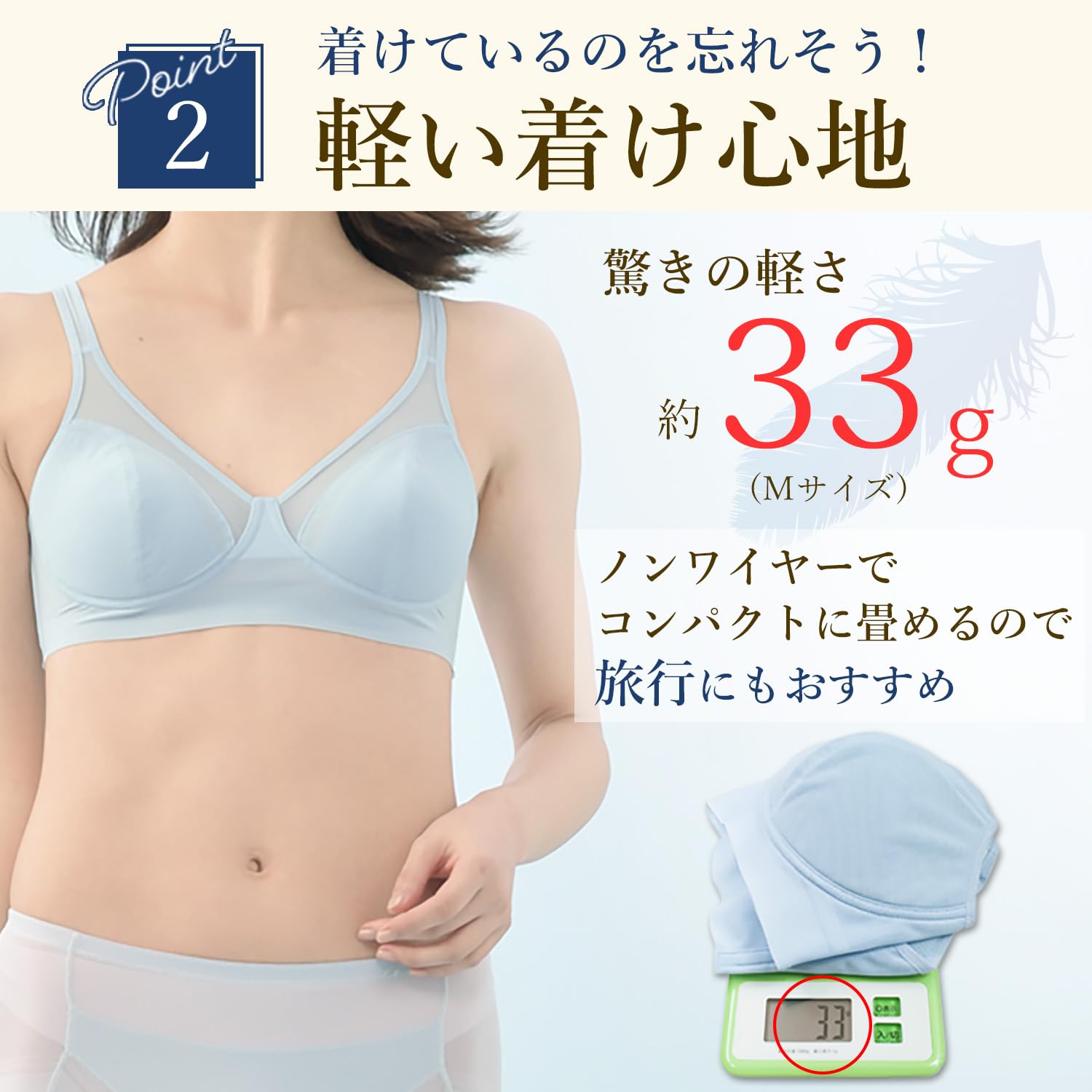 わずか約33g(Mサイズ)の軽さで着けていることを忘れそうな着け心地!
