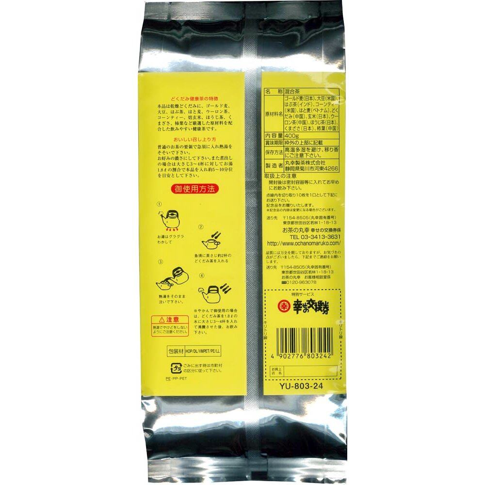 お茶の丸幸 十一種配合どくだみ茶 400g 内容量:400g 原材料:どくだみ茶、ゴールド茶、大豆、はぶ茶、はと麦茶、ウーロン茶、コーンティー、焙玄茶、ほうじ茶、くまざさ、柿葉 商品サイズ(高さ×奥行×幅):30mm×250mm×110mm くせのあるどくだみと10種の健康素材を独自のブレンド技術で飲みやすく仕上げました。 使用方法 温度:80-90度、時間:3-5分、茶葉:1茶匙/150mlの水で淹れてください。