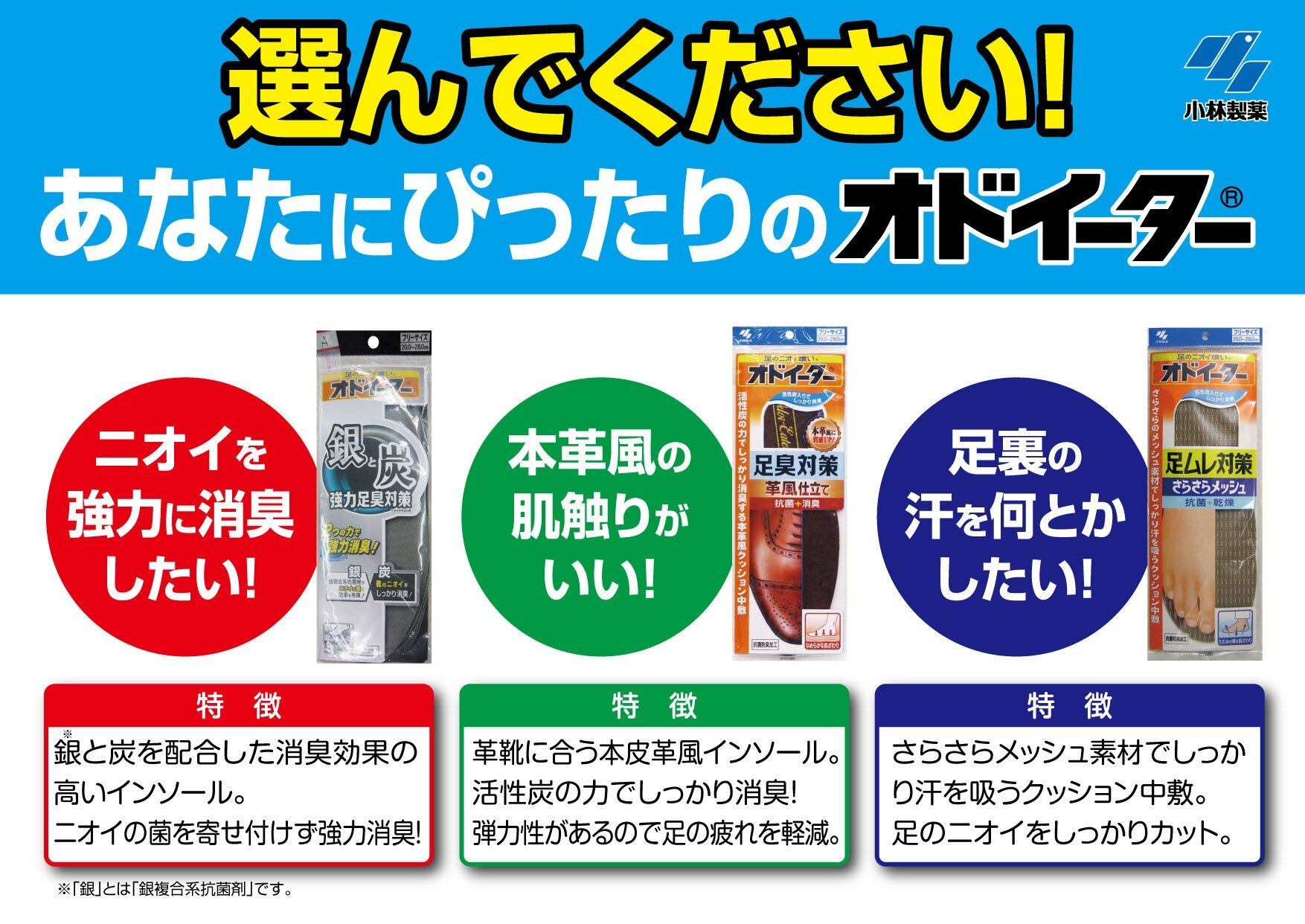 【使用方法】 オドイーターはいろいろなサイズ(20.0cm~28.0cm)の靴にご使用いただけます。 (1)インソール裏側のサイズ線に沿って、最初はご自分のサイズより少し大きめに切り取ってから、靴に合わせて調整してください。 (2)必ず黒い面を下にして敷いてください。 ※汚れた場合は、湿った布をかたくしぼってふいてください。 ※使用条件にもよりますが約1ヶ月間使用できます。