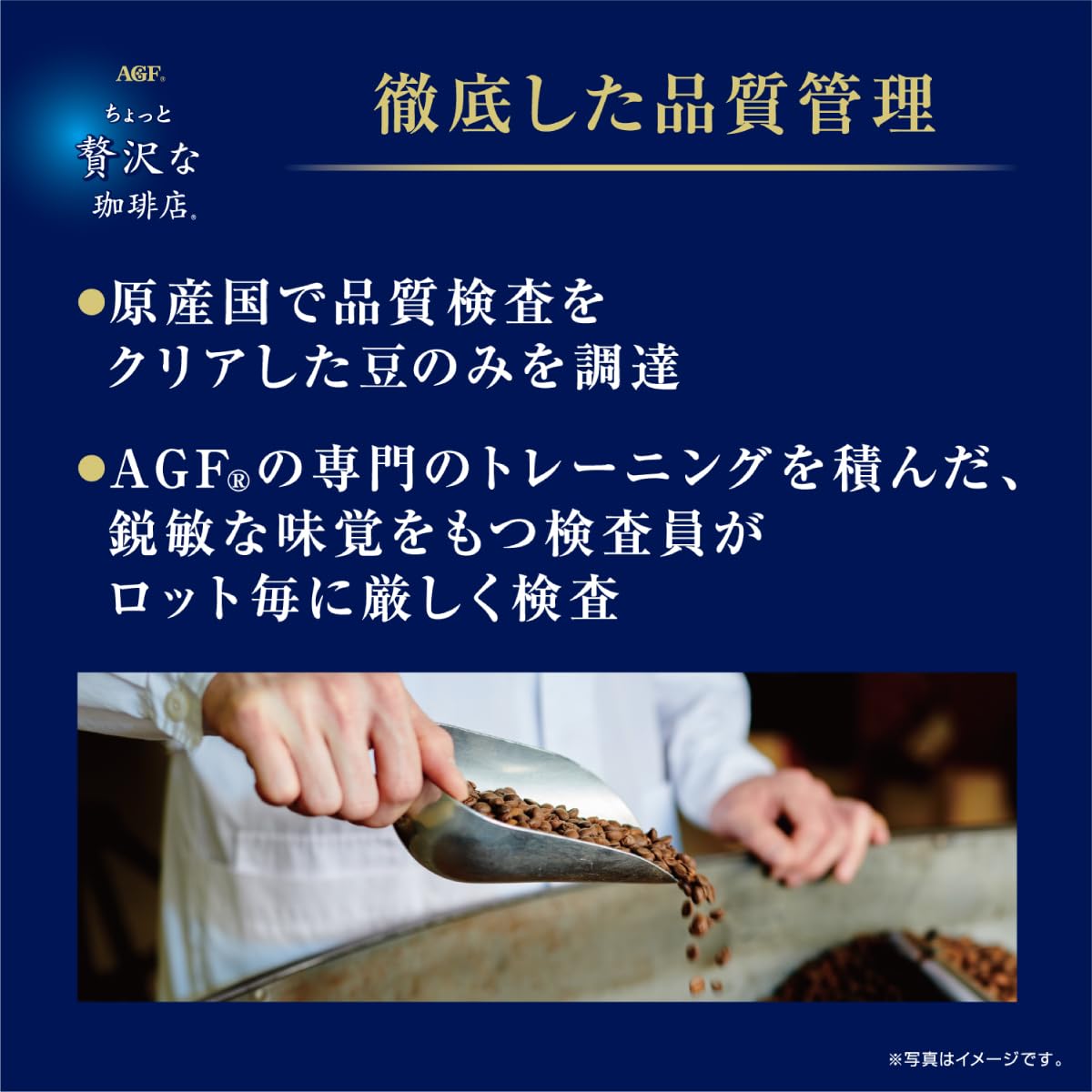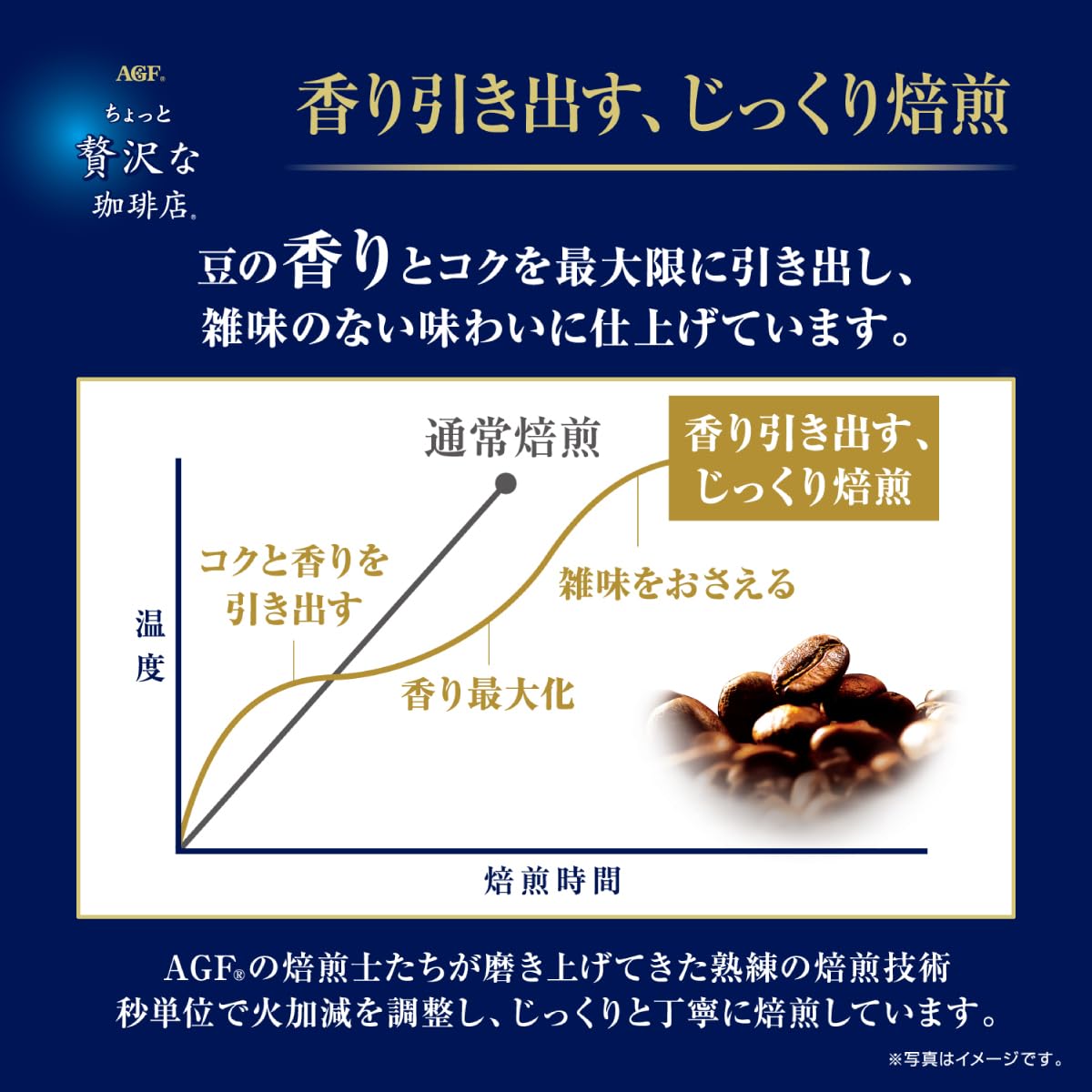 香り引き出す、じっくり焙煎。「ちょっと贅沢な珈琲店」レギュラー・コーヒーは、厳選した豆の特徴に合わせて、AGF独自の「香り引き出す、じっくり焙煎」技術により、丁寧に焙煎した豊かなコクと深く濃い香り。珈琲店のマスターがハンドドリップで淹れたような贅を尽くした奥深い味わいと香りが楽しめるレギュラーコーヒーです。