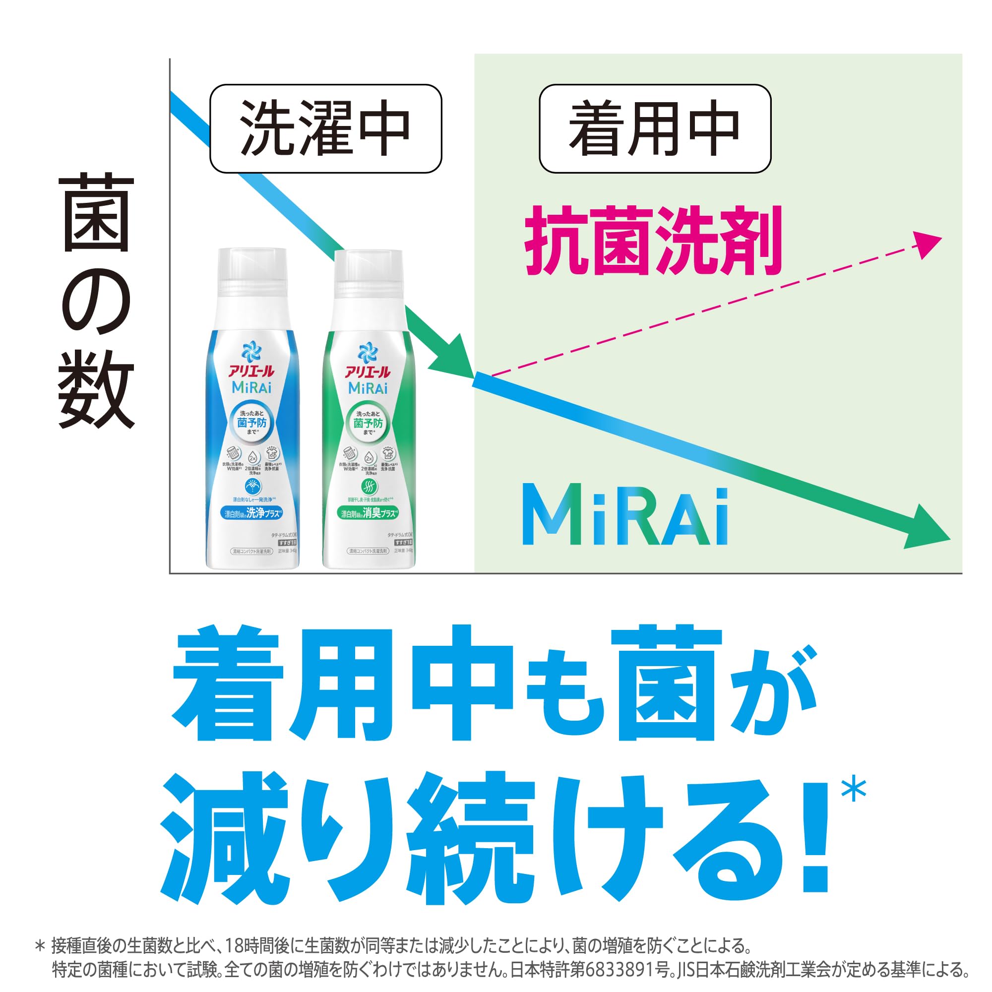 *当社液体洗剤と23年10月時点の市場No.1酸素系液体漂白剤の併用での比較。P&G調べ。臭いの度合で防ぐ程度は異なる。漂白剤は洗濯機直投入の条件で試験。 **日本特許第6833891号 *1 接種直後の生菌数と比べ、18時間後に生菌数が同等又は減少したことにより、菌の増殖を防ぐことによる。特定の菌種において試験。全ての菌の増殖を防ぐわけではありません。*2 衣類の菌予防と洗濯槽の防カビ効果 *3 アリエール液体で *4 P&G調べ。臭いの度合で防ぐ程度は異なる。 *5 アリエールジェル比 *6 カビを除去するわけではありません。
