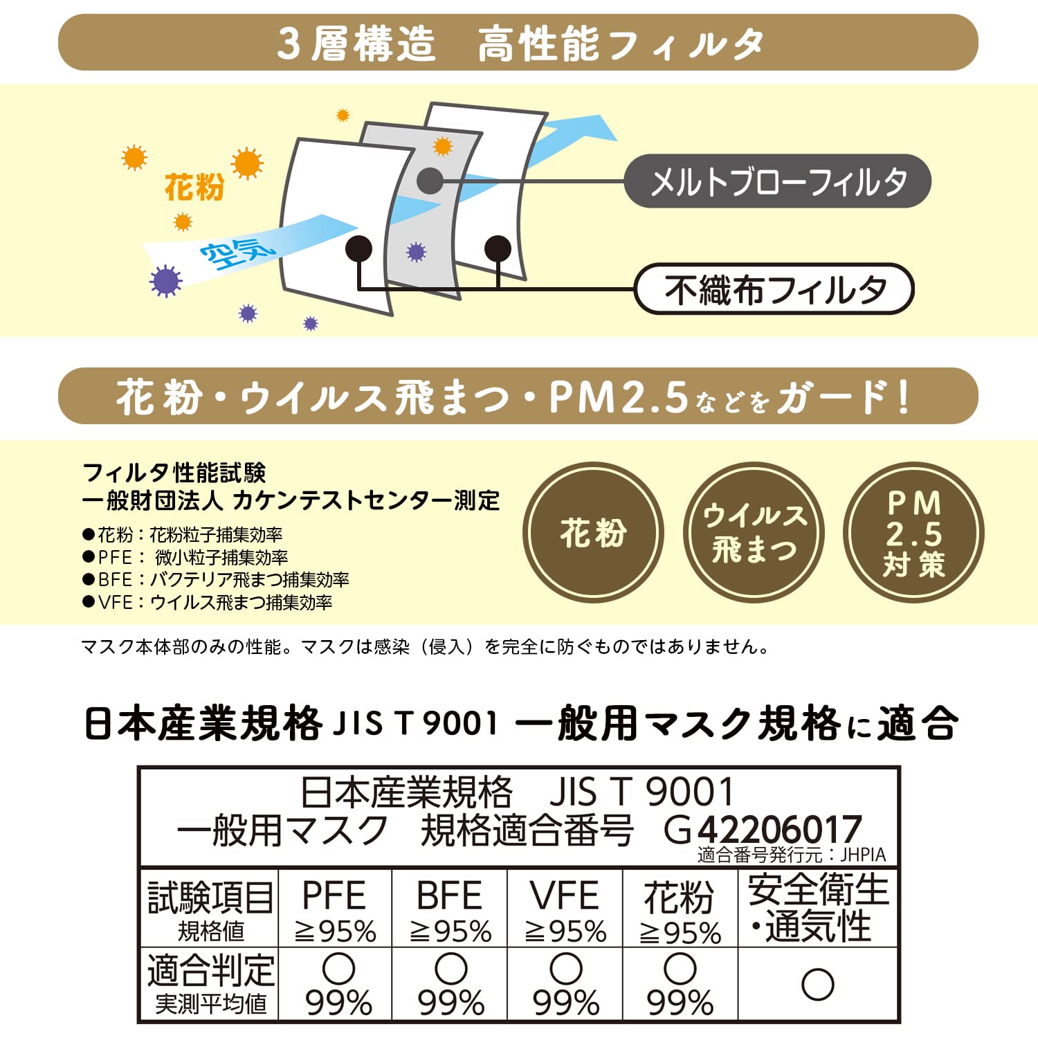 ●BFE、PFE、VFE、花粉の試験済み。99%ガードフィルタ採用(マスクは感染を完全に防ぐものではありません)。