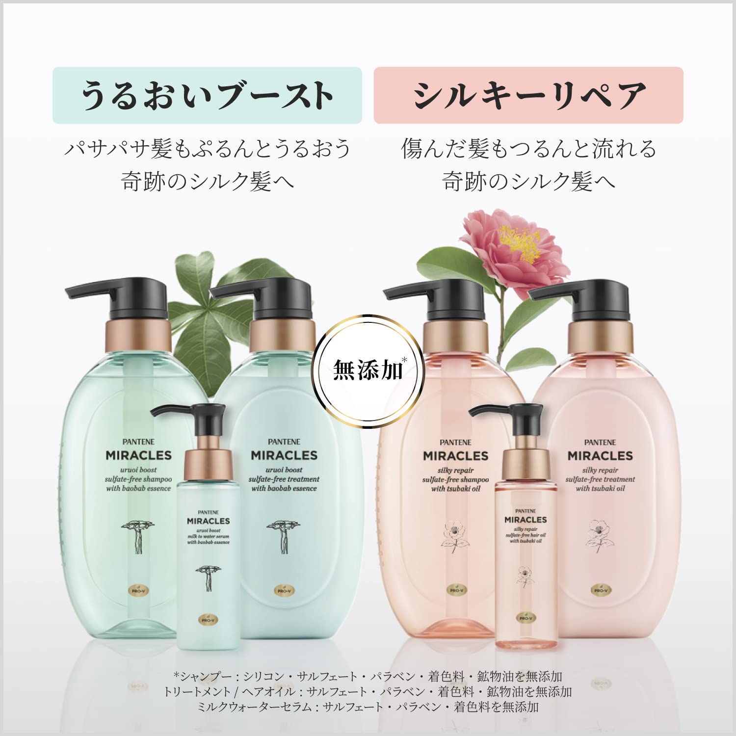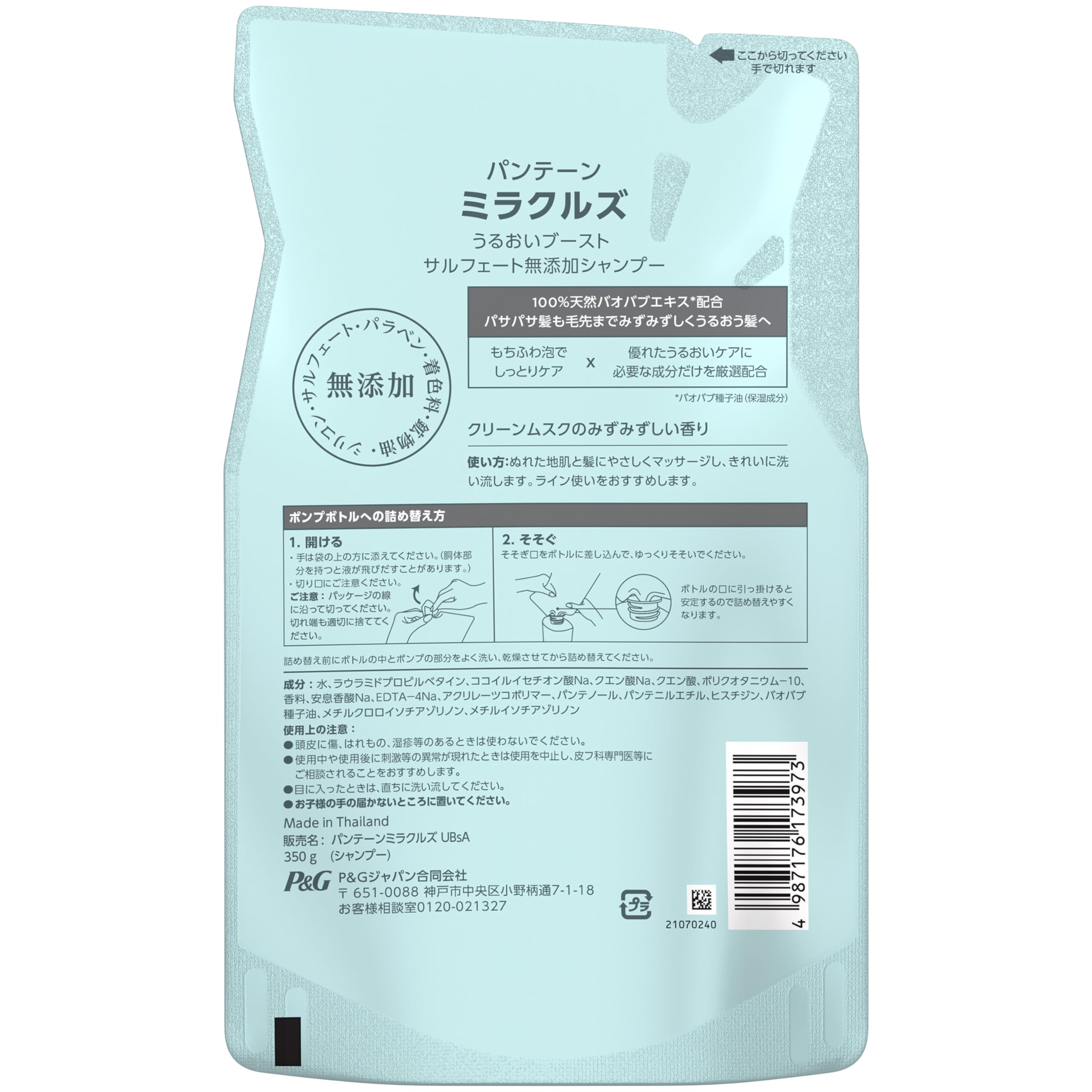 パンテーン ミラクルズうるおいブーストサルフェート無添加シャンプー詰め替え350g100%天然バオバブエキス * 配合 パサパサ髪も毛先まで、みずみずしくうるおう髪へ もちふわ泡でしっとりケア優れたうるおいケアに必要な成分だけを厳選配合無添加: シリコン・サルフェート・パラベン・着色料・鉱物油* バオバブ種子油(保湿成分)