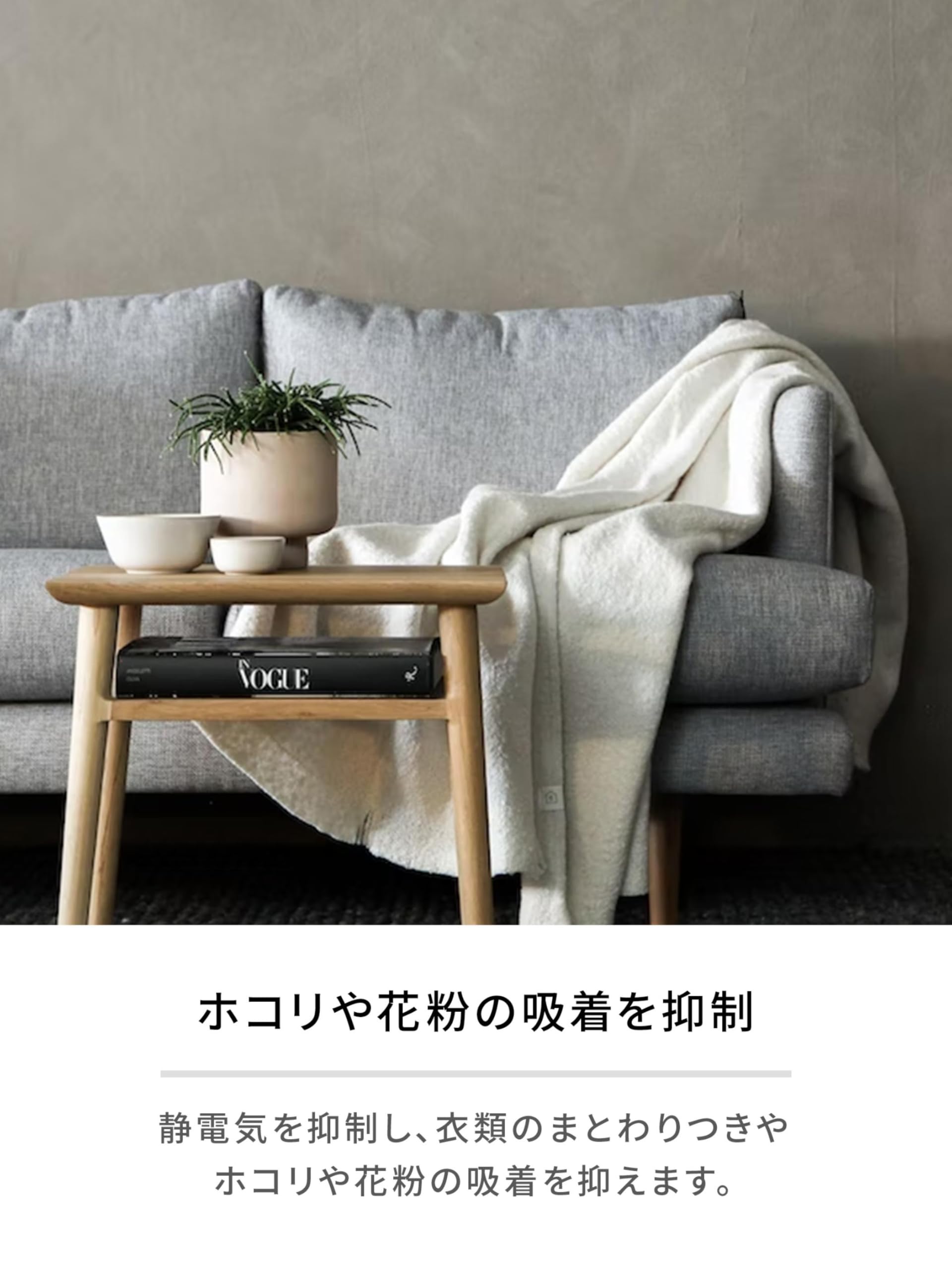 静電気を抑制し、衣類のまとわりつきやホコリ・花粉の吸着を抑えます。