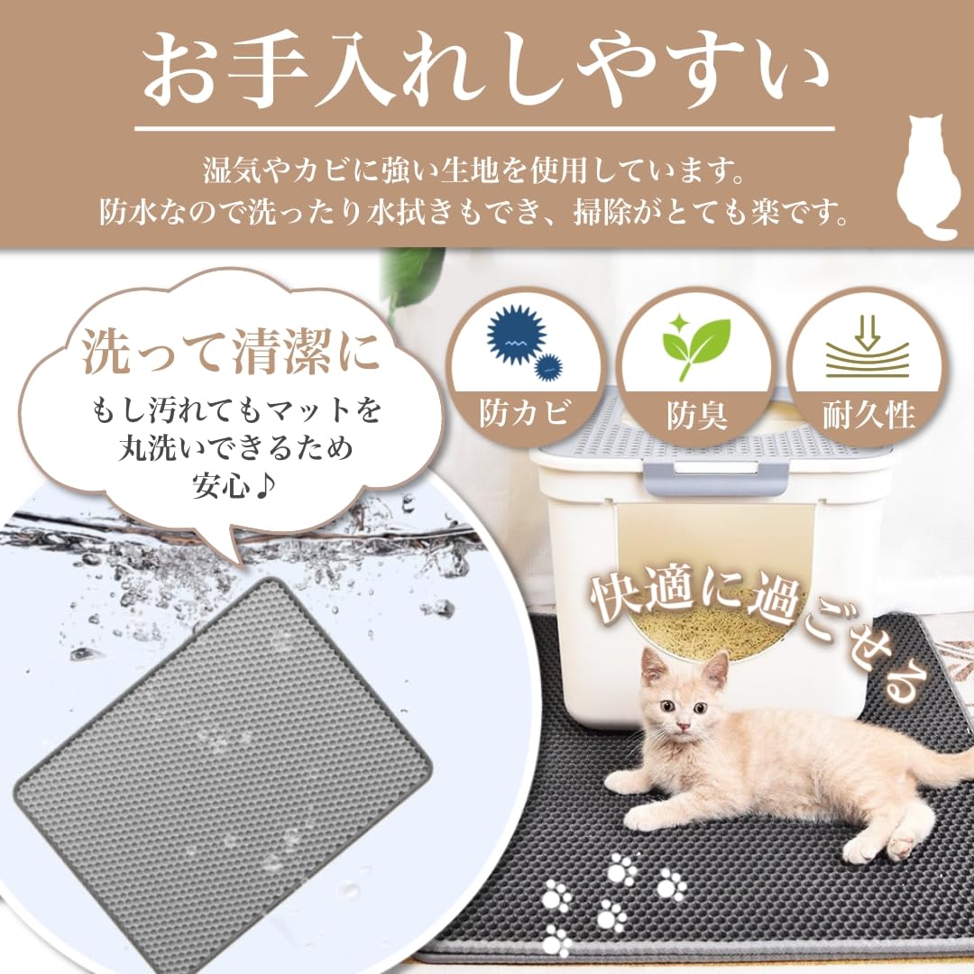 商品名:猫トイレマット(猫砂マット) サイズ:約90×60×厚み1.3cm 重量:約600g(個体差あり) 材質:EVA(エチレン酢酸ビニル) 構造:2重構造(ハニカム上層+砂受け下層) 特長:防水/防カビ/防臭/滑り止め/丸洗い可/耐久性 カラー:ライトグレー、ダークグレー、ブラック 用途:猫用トイレ前マット、ペットトイレ周りの砂受け お手入れ:水洗い・水拭き可。陰干し推奨 注意事項:火気の近く・直射日光での高温放置は避けてください。サイズは測定方法により±数mmの誤差が生じます。