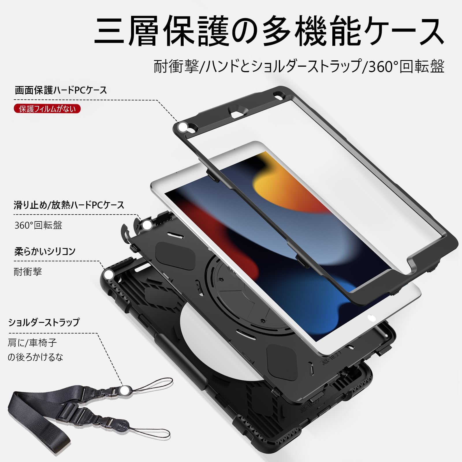 「高品質」:のiPadケースは軍用レベル認証があります。三層保護頑丈なデザイン、ipadの前は頑丈のハード?材料でガッチリ固め、第三層と縁は柔らかいシリコン材料で衝撃を抑える、高品質の耐熱PCと高分子スポンジで放熱機能付きます。耐衝撃、保護力強化、防塵などの機能があります。移動、持ち運び、子供使用が頻繁などの場合にこの耐衝撃iPadケースはお客様大事なiPad保護に役立ちます。二つ画面保護「フィルムあるとフィルムなし」ご自由に選んでください。