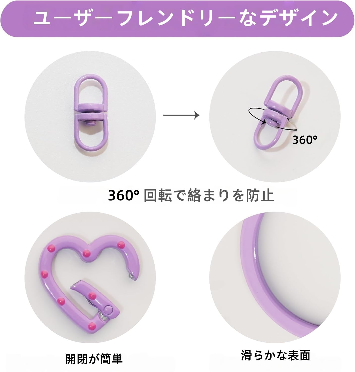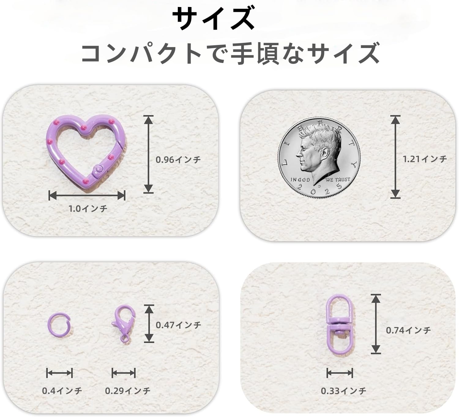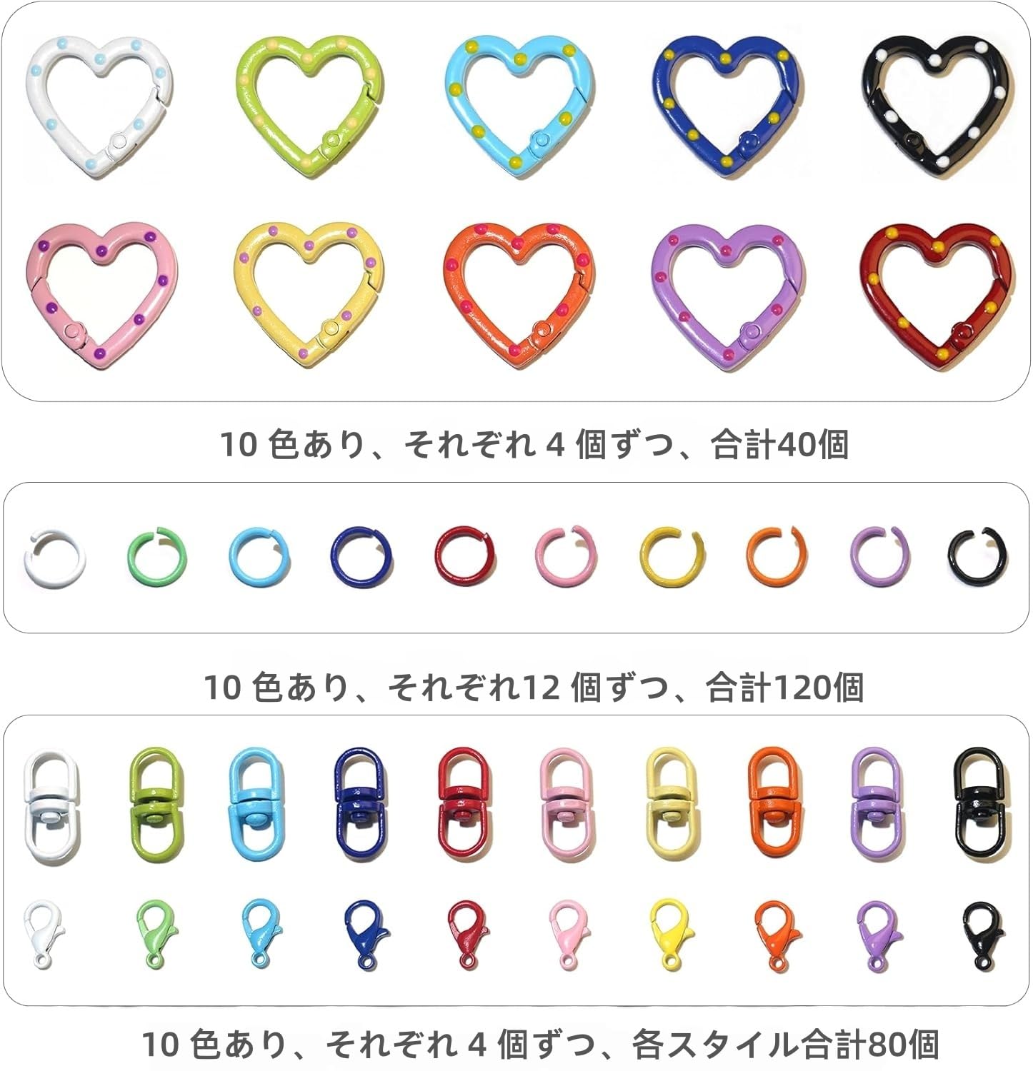 全て揃う4点セット:ハートカン、スイベルロック、カニカンが各40個、10mm丸カンが120個の合計240個がセットになっています。キーホルダーやチャーム作りにすぐに使える便利なキットです。手芸好きの方から初心者の方までお楽しみいただけます。