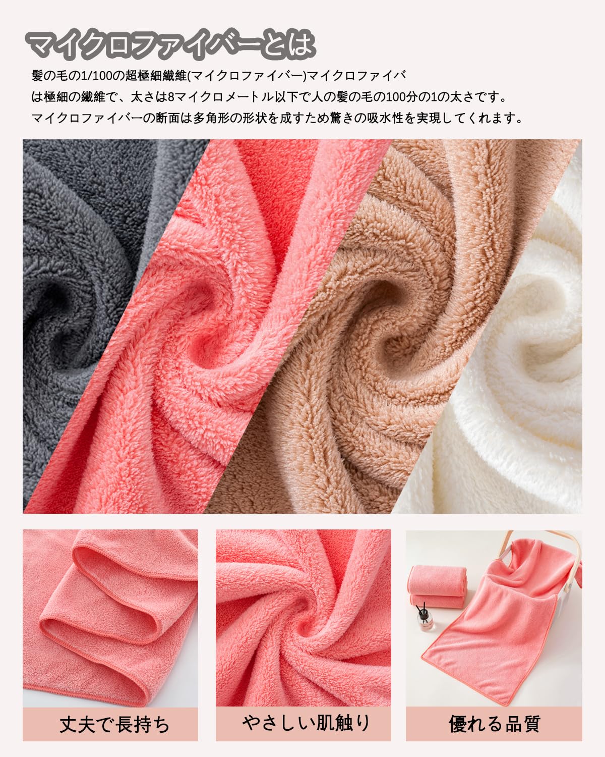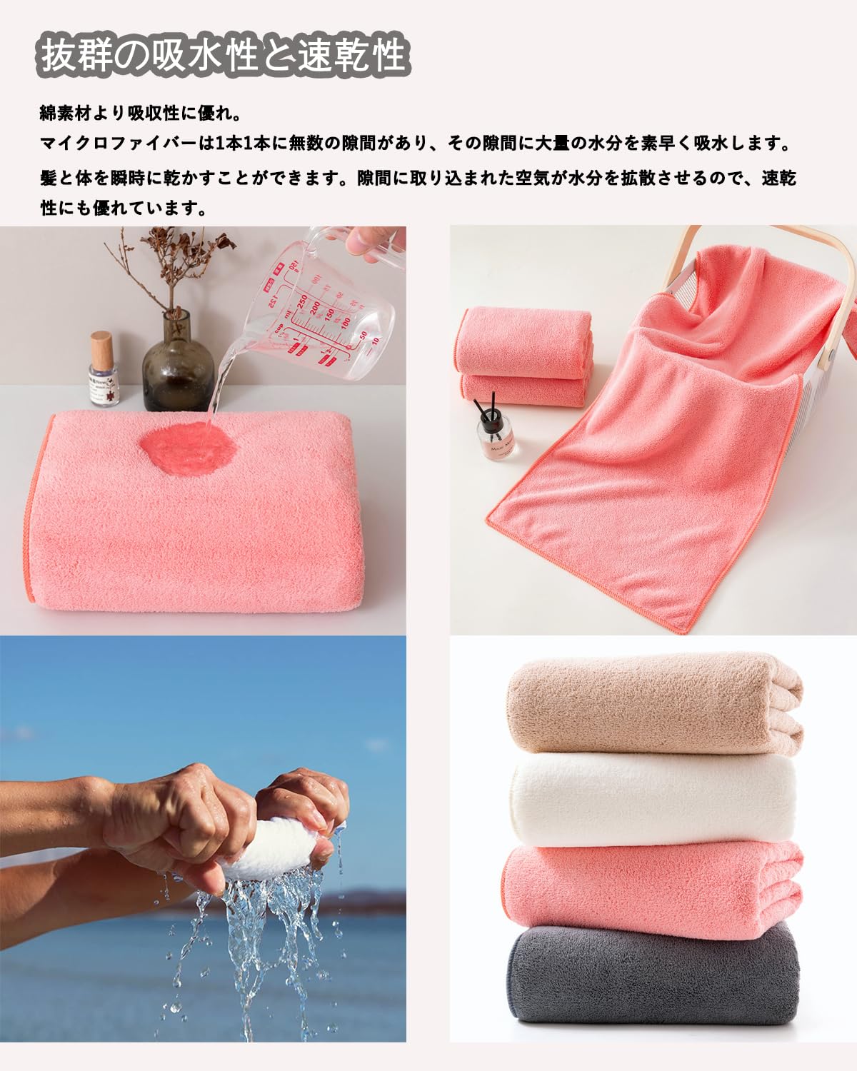 【抜群の吸水性と速乾性】綿の素材より吸水性が優れます。マイクロファイバー素材の表面は数えられない隙間があり、その隙間に大量の水分を素早い吸水できます。髪や肌にそっと当てるだけで水分が吸収される素材であり、また汚れも落としやすい特徴があります。隙間に取り込まれた空気が水分を拡散させるので、速乾性のポイントで、バスタオルの雑菌を抑え、健康を保つことができます。