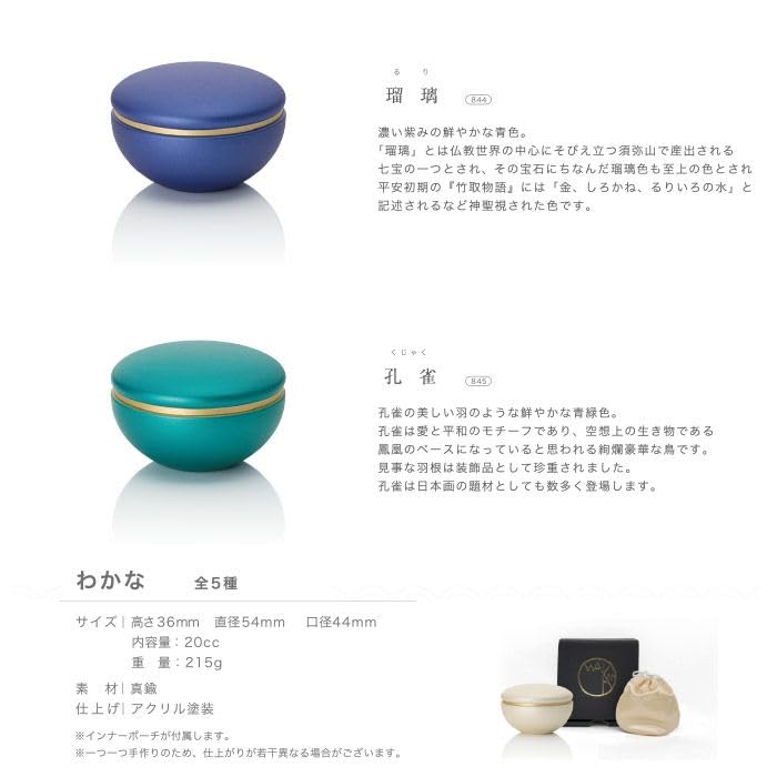 骨つぼサイズ:高さ36mm×直径54mm 口径:44mm×深さ25mm / 素材:真鍮・アクリル塗装 / 重量:215g / 内容量:20cc / 付属品:ミニ骨壺用形見袋