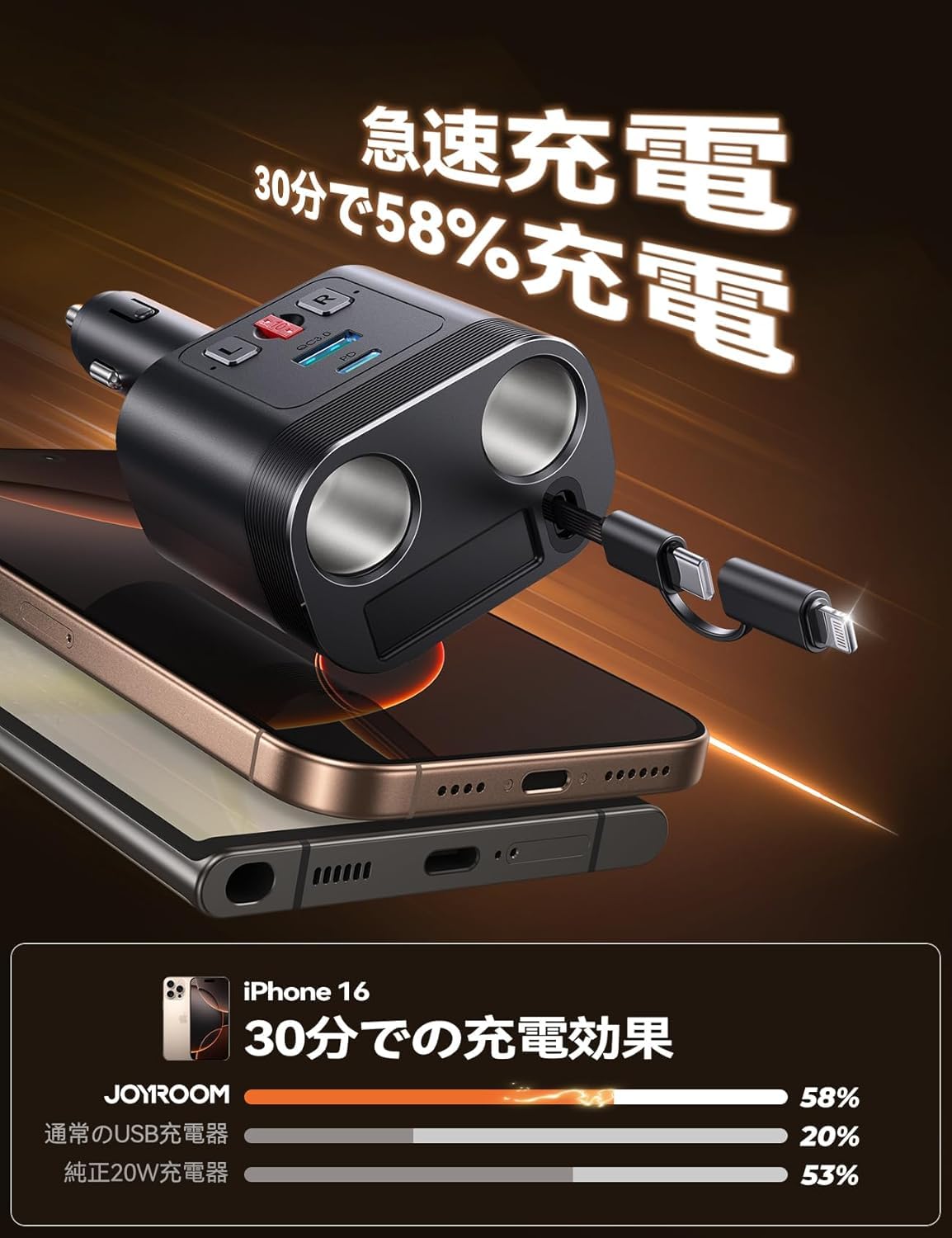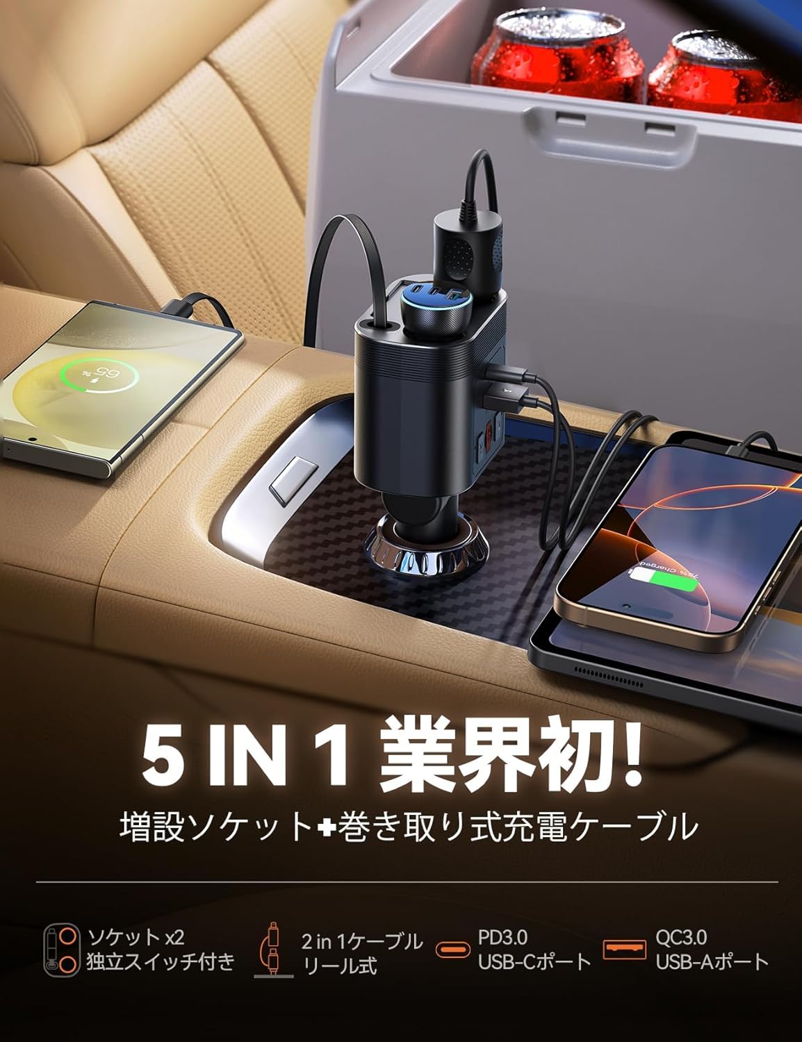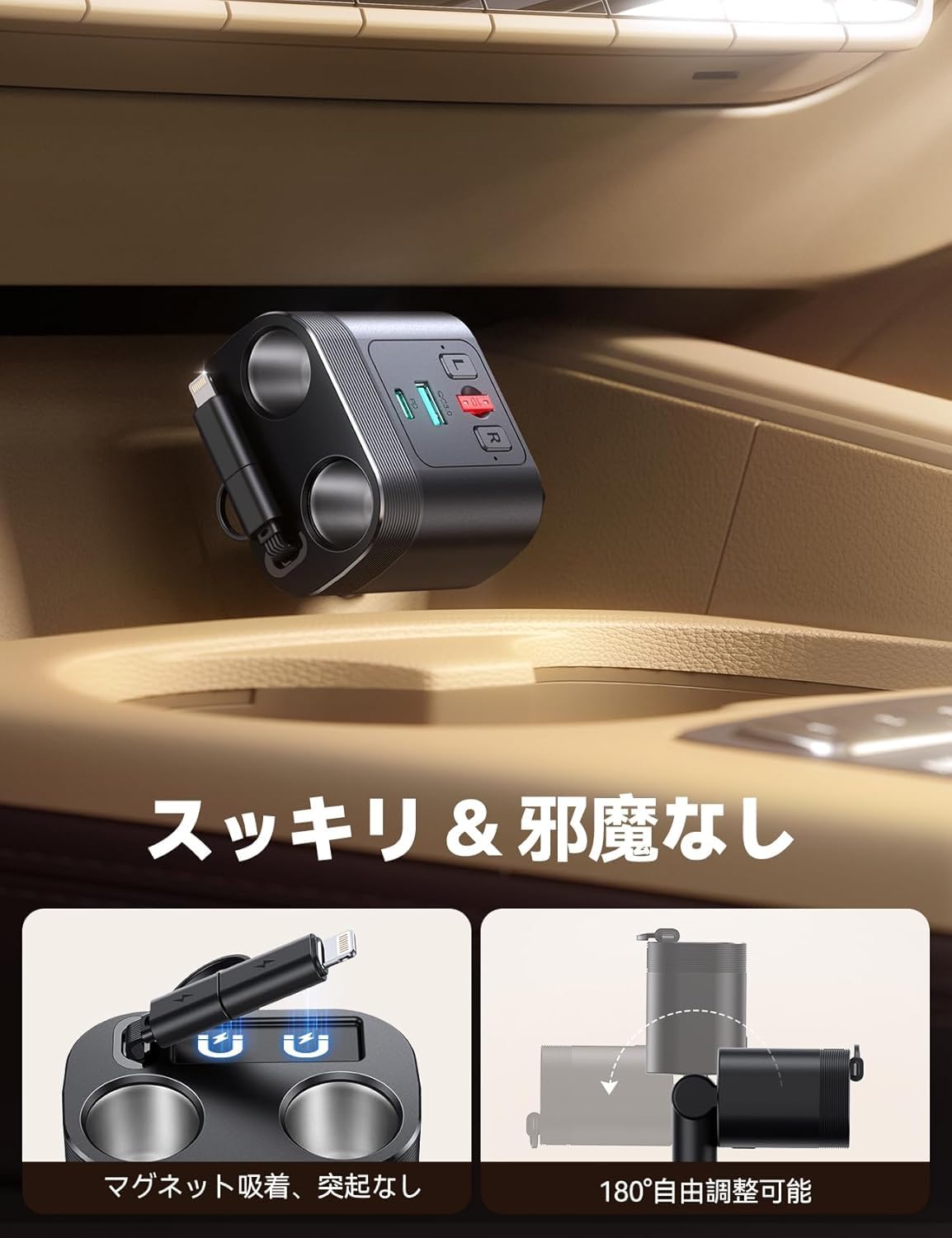 【5-in-1多機能車載充電器】 シガーソケット 増設で2連のシガーライターソケットを搭載します。さらに1本の巻き取り式Type-C to Lightning充電ケーブル、1つのUSB-Cポート、1つのUSBポートを備え、最大5つのデバイスを同時に使用可能です。これ1台あれば、車中のスマホもすべてのデバイスも同時充電OK!さらに、巻き取り式ケーブルで車内を美しく保つだけでなく、使用後もスッキリ収納できます。注意事項:①本製品を車載ソケットに確実に固定してください【完整に挿入されていない場合、発熱や充電不良の原因となります】②ソケットの合計最大出力は80Wです。安全のため、容量を超える車載電器の使用はお控えください。