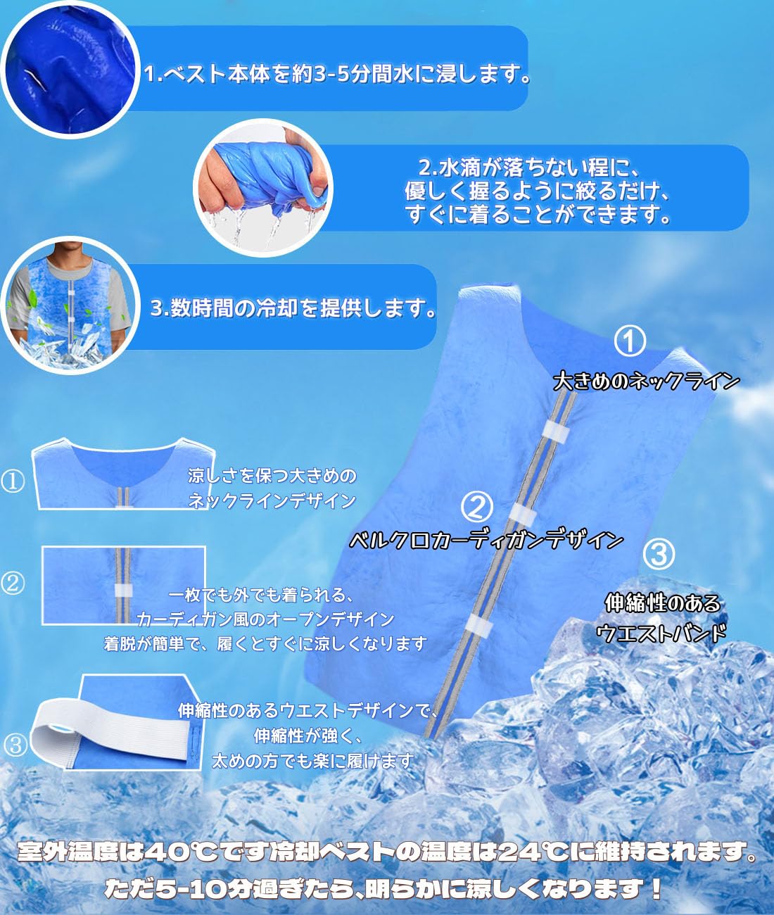 【2025新登場冷却ベスト!瞬間冷却】冷却ベストは省エネ効果があり、水だけの力で身体を快適に冷やし快適に作業できます。電気や保冷剤を一切使用せずに最大?3?6時間(屋外)〜10時間(屋内)?の持続冷却を実現。冷たい氷水に5分間浸して、あるいは冷蔵庫に入れて、水分をたっぽり含ませて軽く絞るだけ、冷却効果があります。