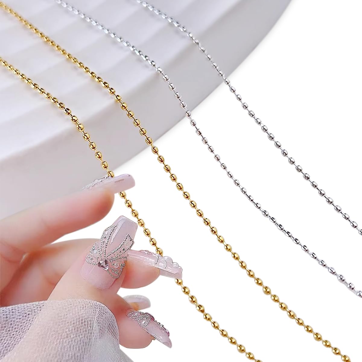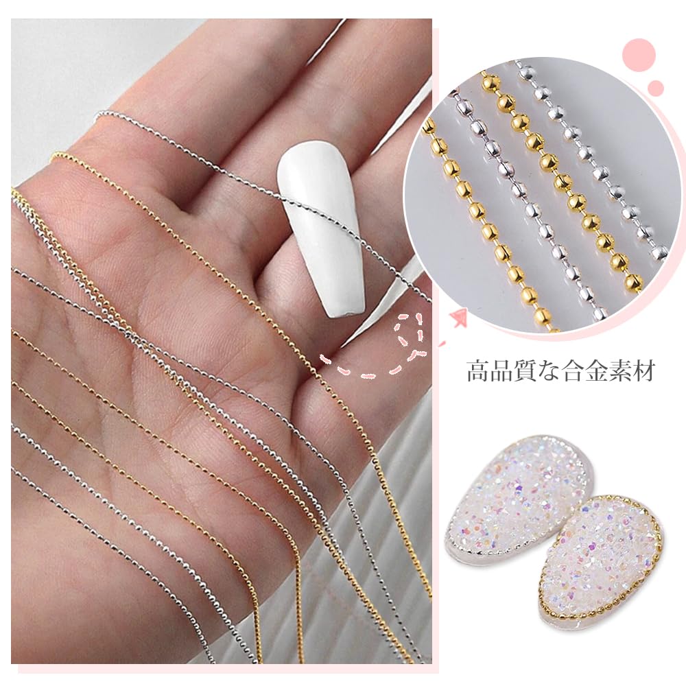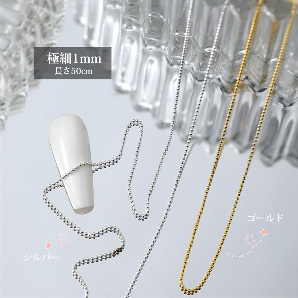 1.【セット内容】このセットには、シルバーとゴールドの各1本、合計2本のスチールボールネイルチェーンが含まれています。0.8mmの極細スチールボールチェーンで、長さは50cmです。
