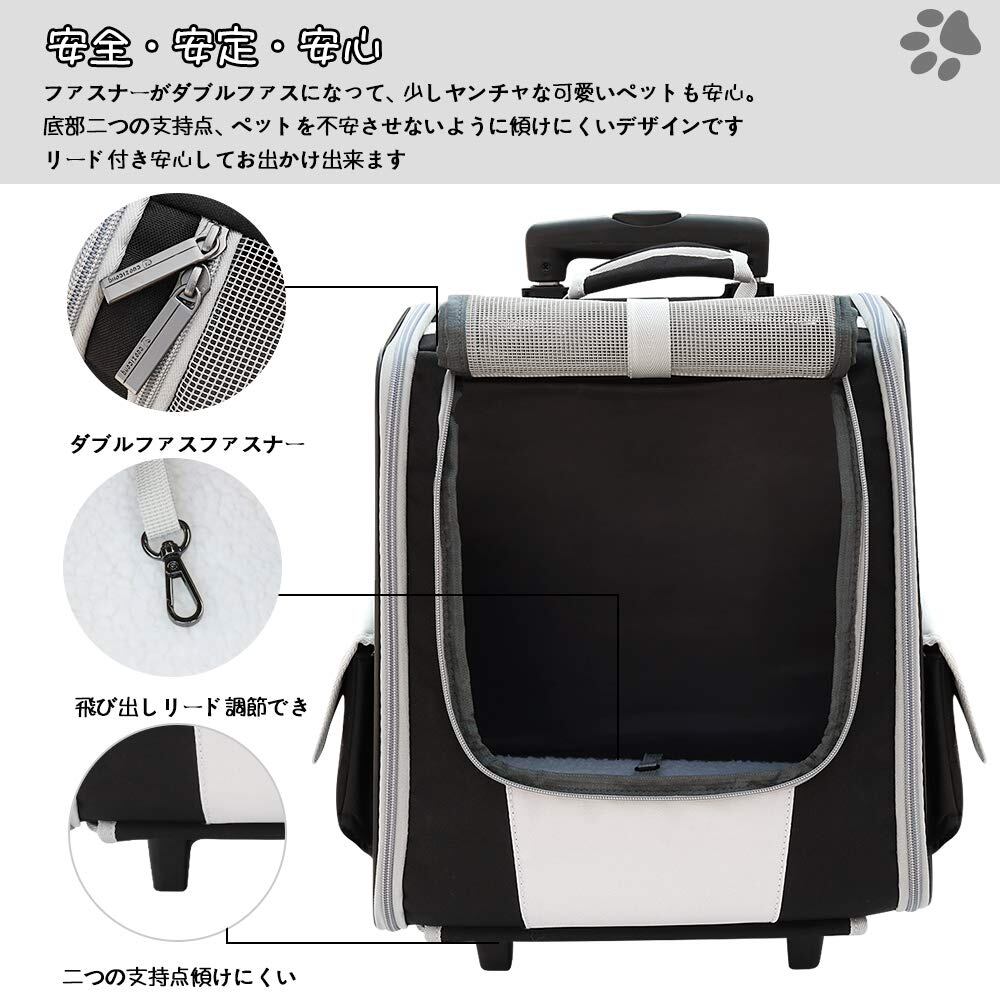 【優れた安全性・安定感】キャスター付き 犬猫 ペットキャリー がダブルファスナーになっておりますので、少しヤンチャな可愛いペットも安心です。改良された底板二つの支持点があり、取り外す可能,安定性アップ、ペットを不安させないように傾けにくいデザインです。突然の飛び出しを防止できる専用リード付き安心してお出かけ出来ます犬用リュック。