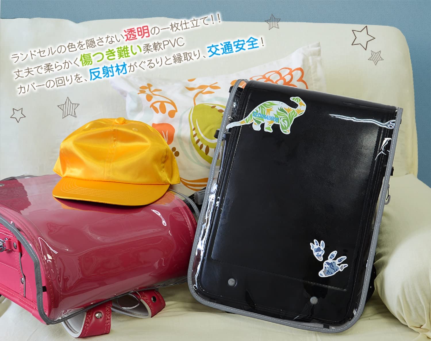 入学時に、レインカバーの取り替えにおすすめ!反射付安心、安全商品をお子様に! ※柔軟PVC素材です。傷つきにくく丈夫です。 ※の交通安全グッズや防犯グッズは交通安全、防犯を目的とし作成された商品ですが、安全をするものではありません。
