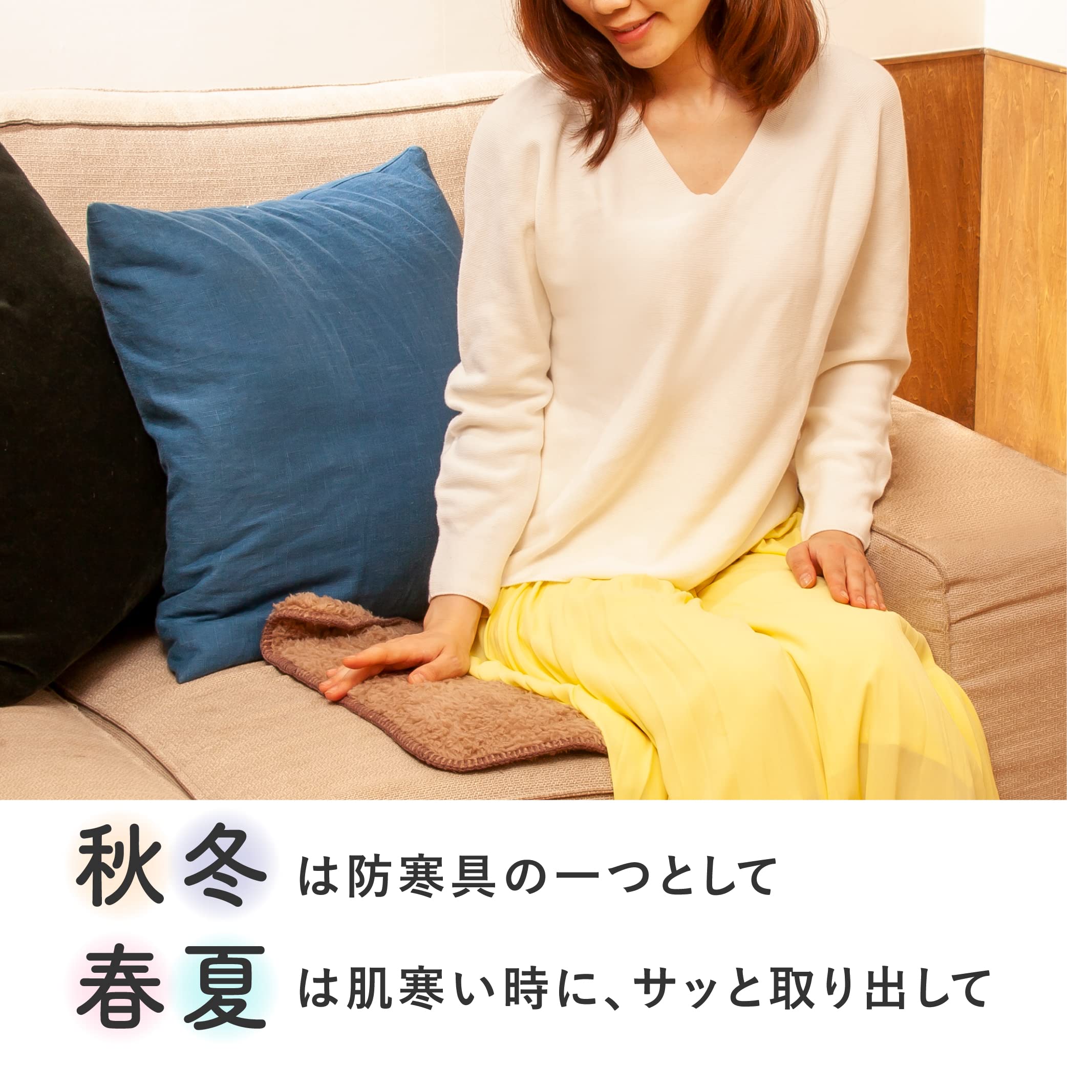 秋冬は防寒具の1つとして、春夏は肌寒いときにサッと取り出して。座面に敷く以外にも使い方いろいろ。ひざ掛けに、背もたれに、お腹に・足元に・クッションカバーに。
