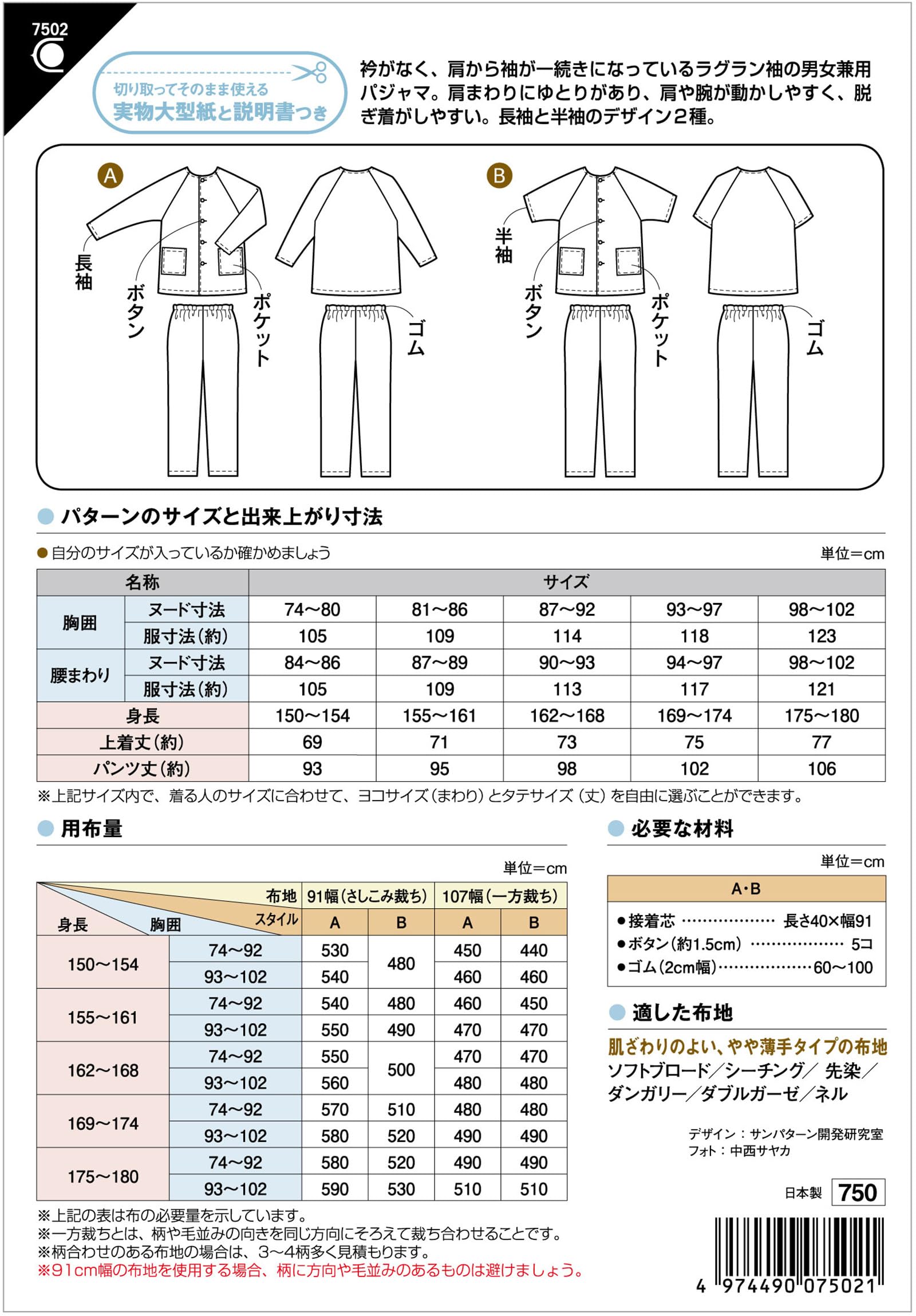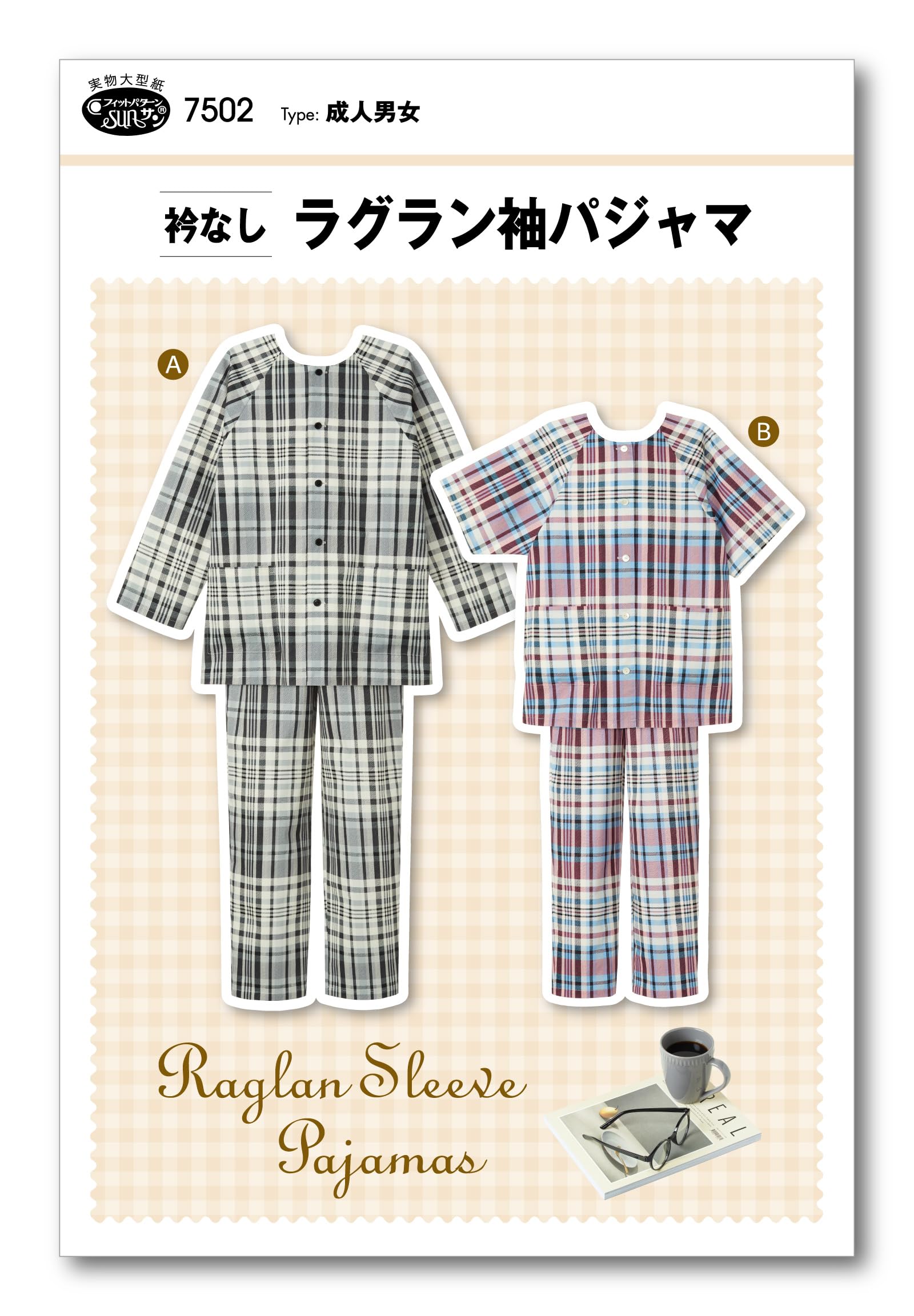 サン・プランニング 型紙 パターン 衿なしラグラン袖パジャマ 7502