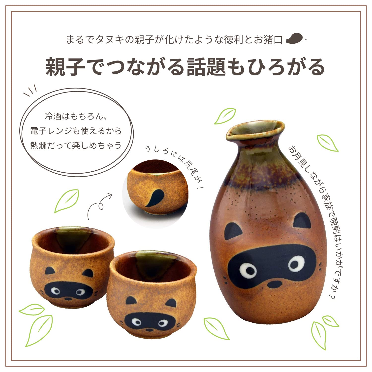 とぼけた表情のたぬきが愛らしい、酒器セット。