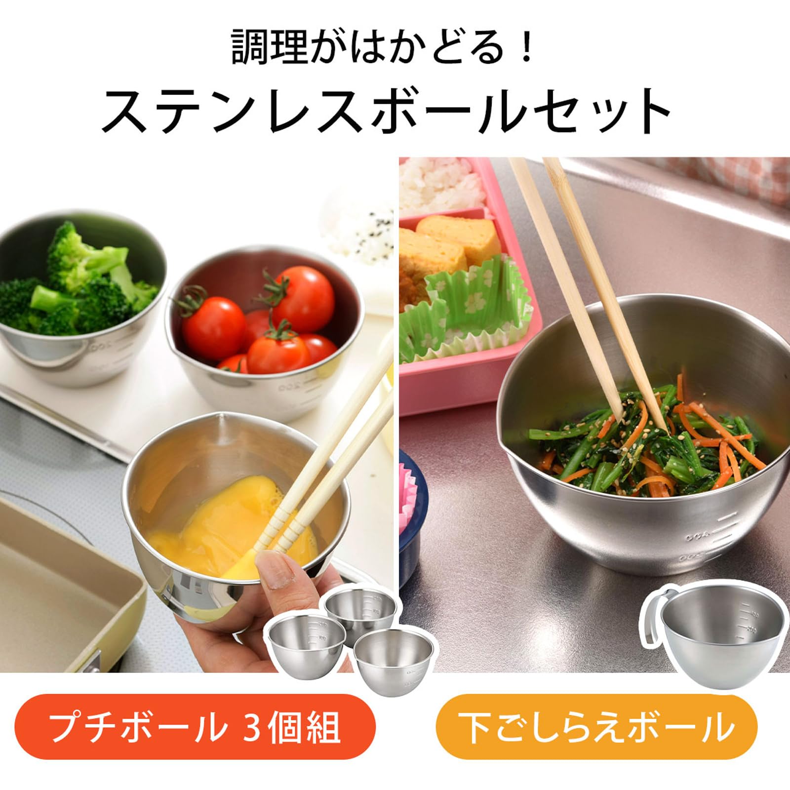下村企販 ボール しっかり持てる 下ごしらえボウル 39783 & ボール 小分け ステンレス 3個組 目盛り 注ぎ口付き 日本製 28867【セット買い】