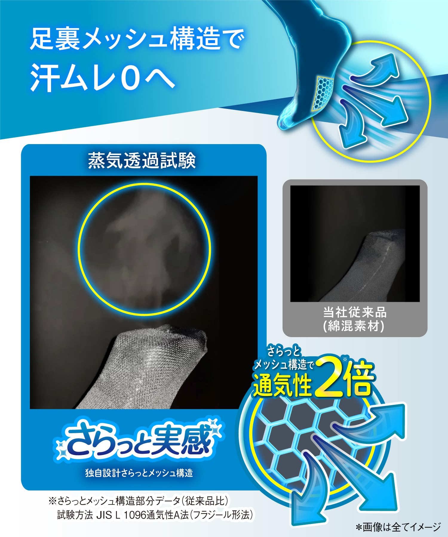 【さらっと実感のヒミツ】接触冷感素材で履いた瞬間ひんやりし、 さらっとメッシュ構造で通気性2倍(※)を実現。 1秒吸水・速乾素材でべたつきやムレが気にならない。さらに、消臭素材で、ニオイ対策も◎毎日履きたくなる、嬉しい機能です。(※従来品比)