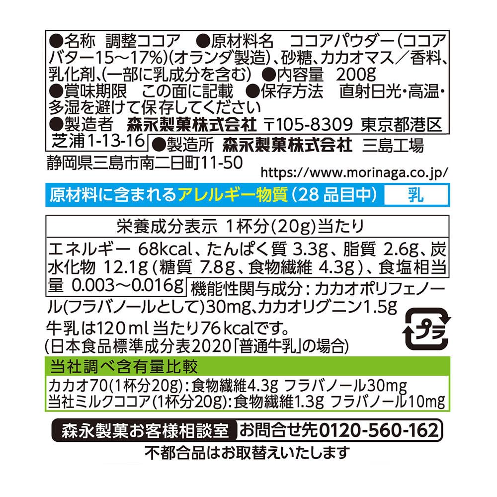 森永乳業 森永製菓 カカオの力 CaCao70 200g ×3個 カカオ成分が70%入っている、クセになるハイビターココアです。 ブランド 森永製菓 商品の重量 200 グラム 商品の形状 粉末 特別な原料 ココアパウダー(ココアバター15?17%)(オランダ製造)、砂糖、カカオマス/香料、乳化剤、甘味料(アスパルテーム・L-フェニルアラニン化合物)、(一部に乳成分を含む) パッケージ重量 0.64 キログラム