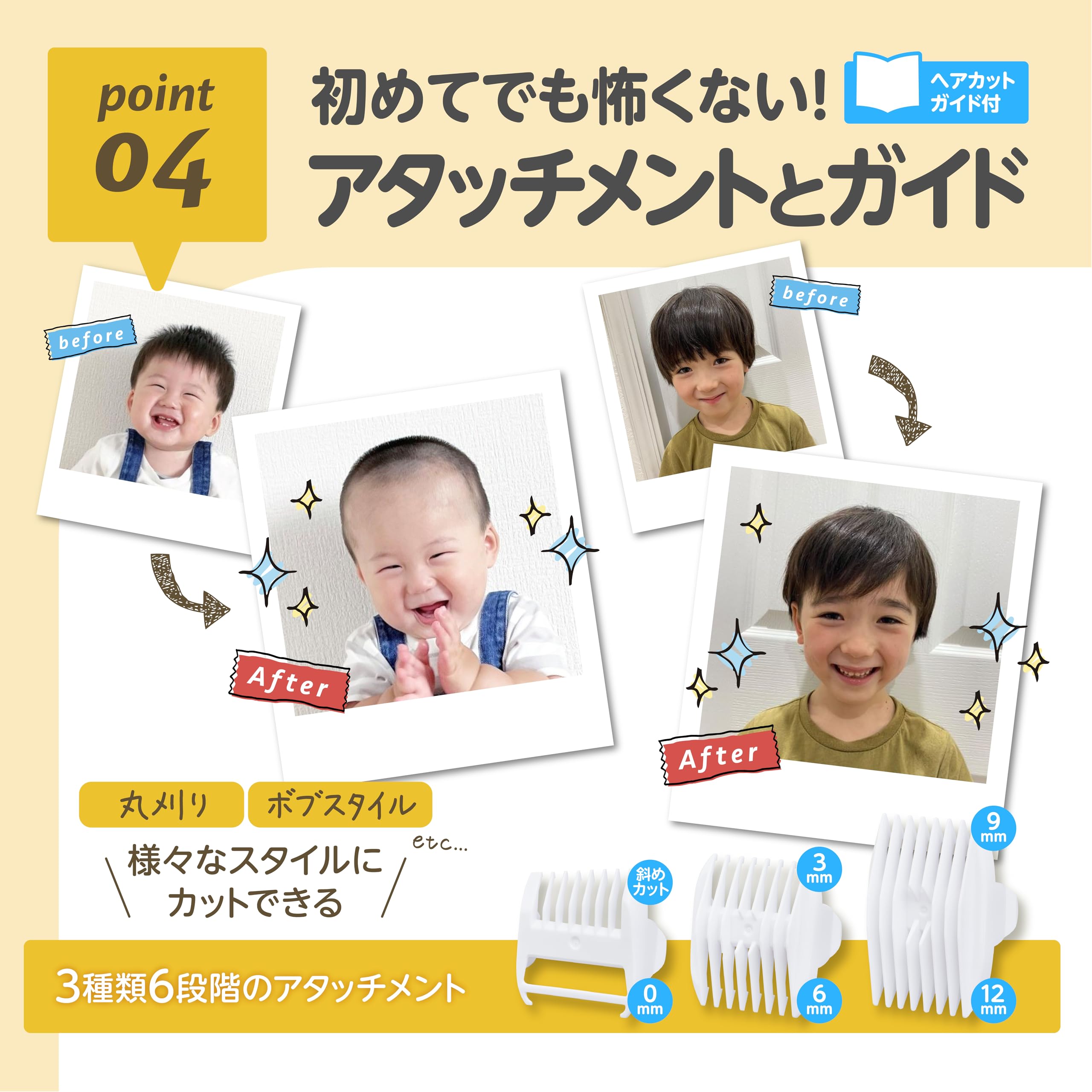 静音モーター内臓の静かなバリカン。バリカンの音が怖い!という大きな音が苦手なお子様でも安心してお使いいただけます。