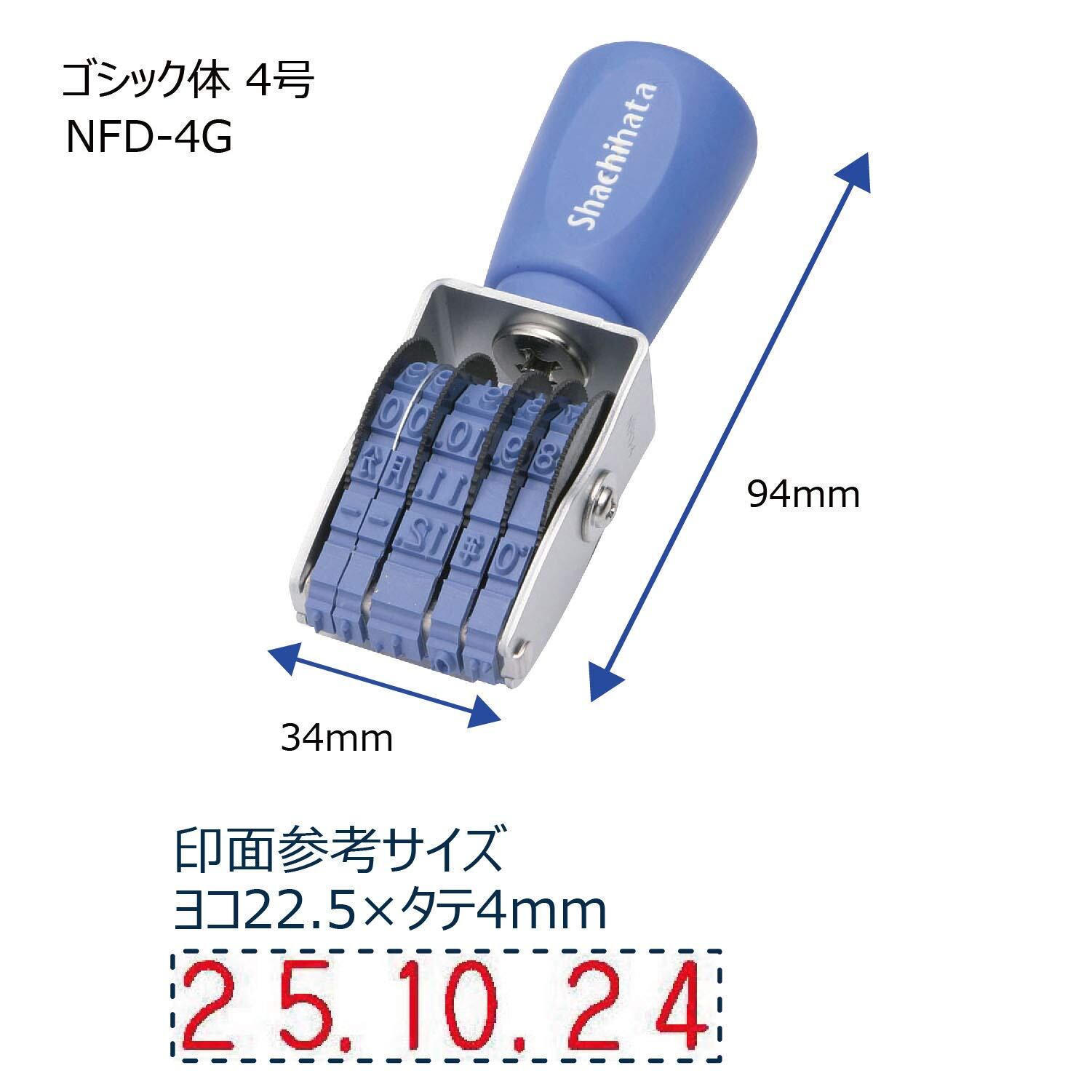 シャチハタ スタンプ 回転ゴム印 欧文日付 4号 約24×4ミリ NFD-4G ゴシック体 【印面サイズ】4号 【書体】ゴシック体 【仕様】ベルトのみの販売は無し 【寸法】34mm×28.5mm×94mm 【重量】44g 握りやすい。捺しやすい。見やすい回転ゴム印。欧文日付4号ゴシック体。エラストマー素材のグリップを採用。