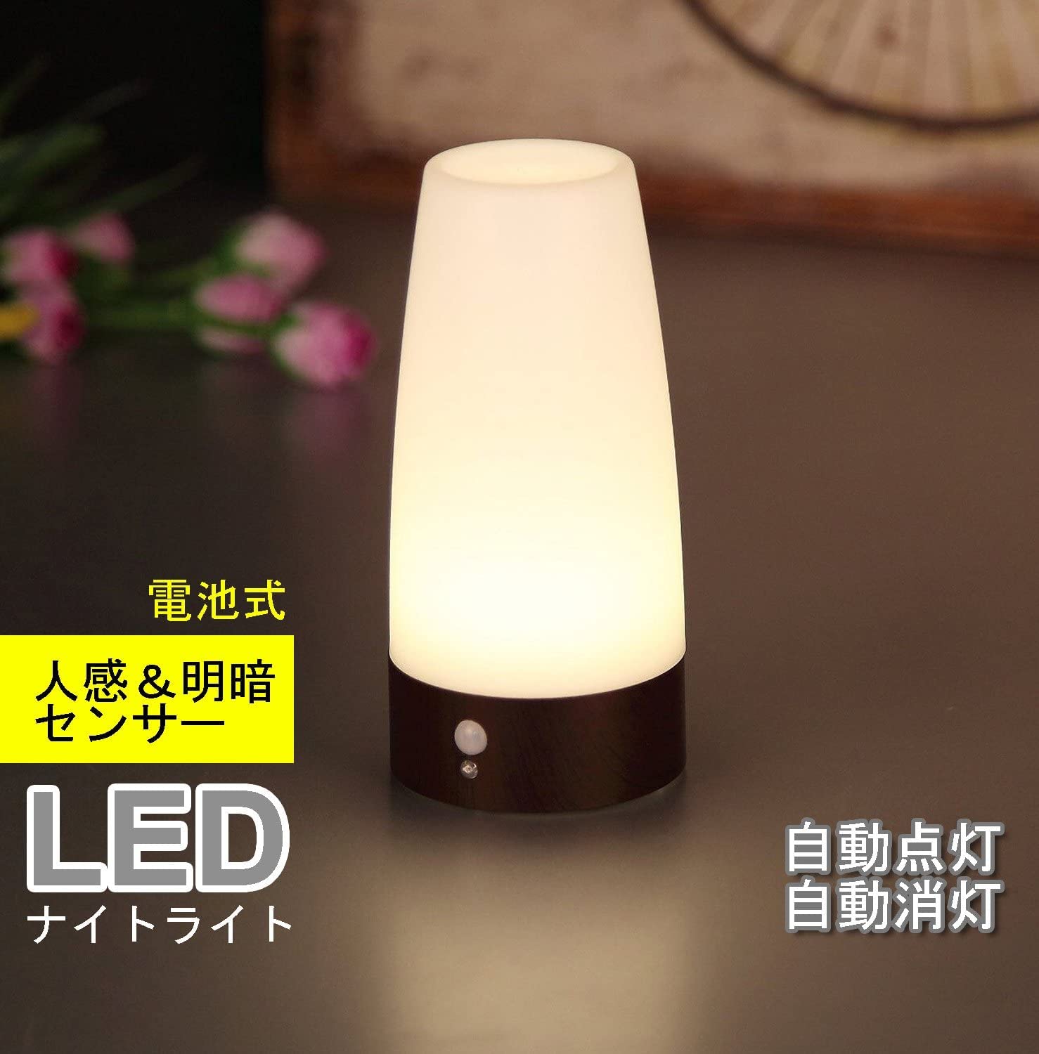 LEDライト 人感&明暗センサーライト ナイトライト 足元ライト ABS 木目調 室内照明 玄関 階段 廊下 電池式 電球色(円形2個)