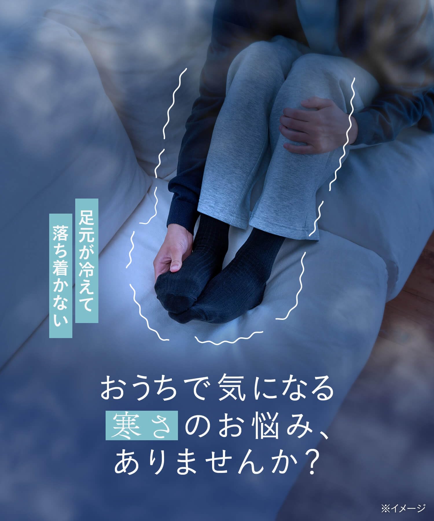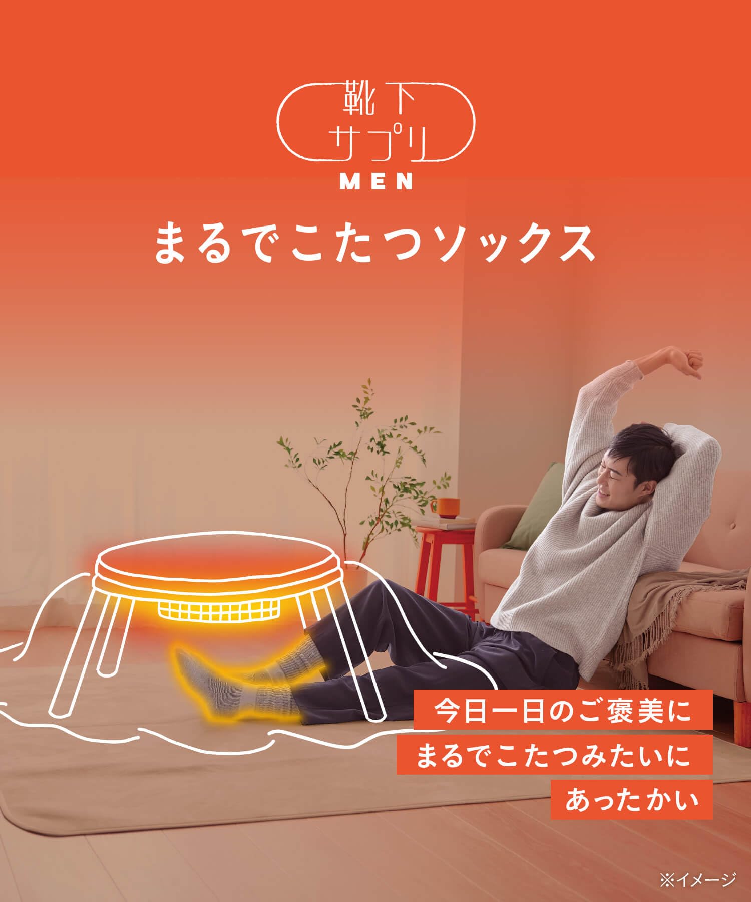 特許技術で足元からカラダを温める「まるでこたつ」シリーズのソックスタイプ(男性向けサイズ)。足首のツボ「三陰交」を特殊素材で温熱刺激することで、身体の内側からポカポカに。まるでこたつみたいな温かさに包まれます。