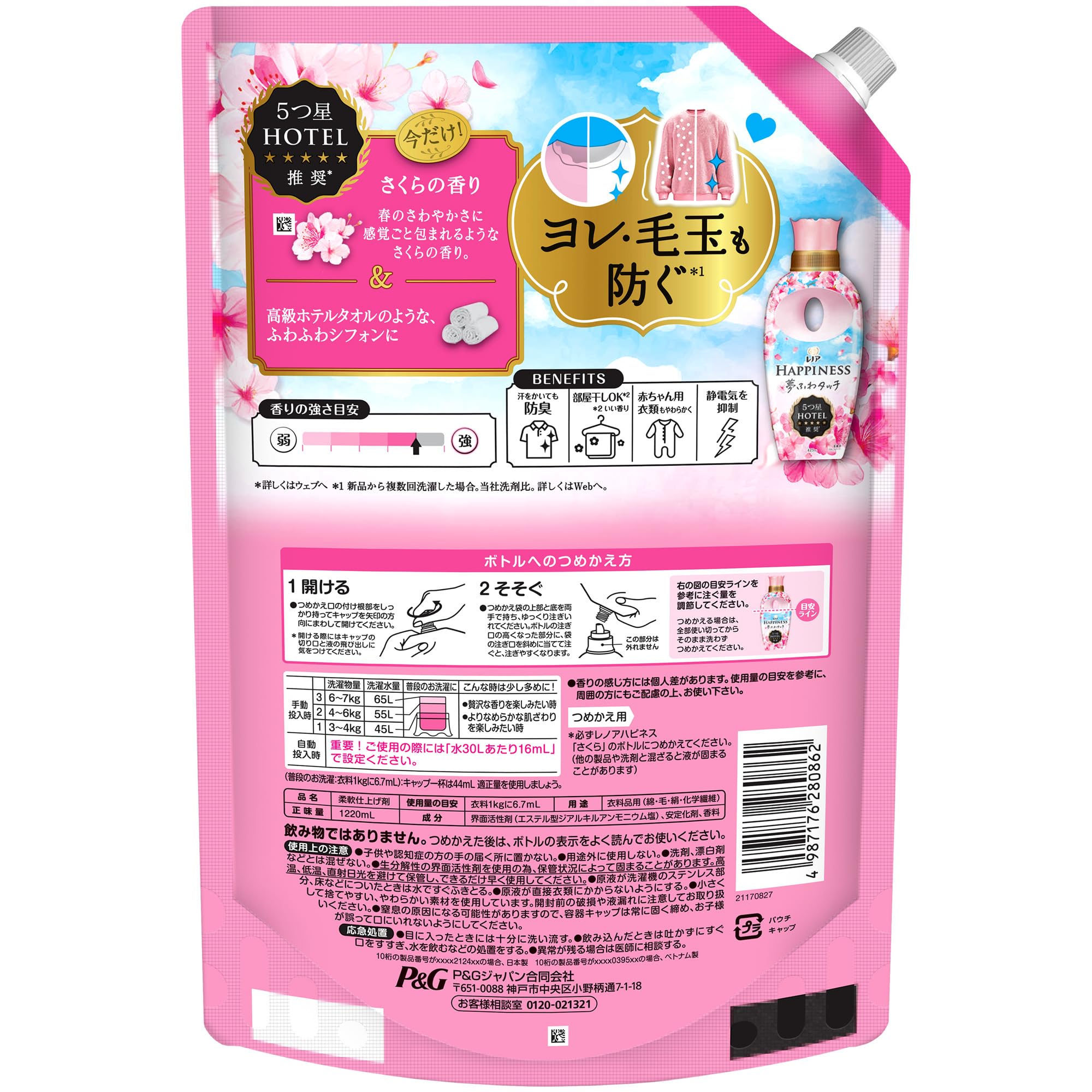 レノア Lenor ハピネス 夢ふわタッチ 柔軟剤 さくらの香り 詰め替え 1,220mL [大容量]