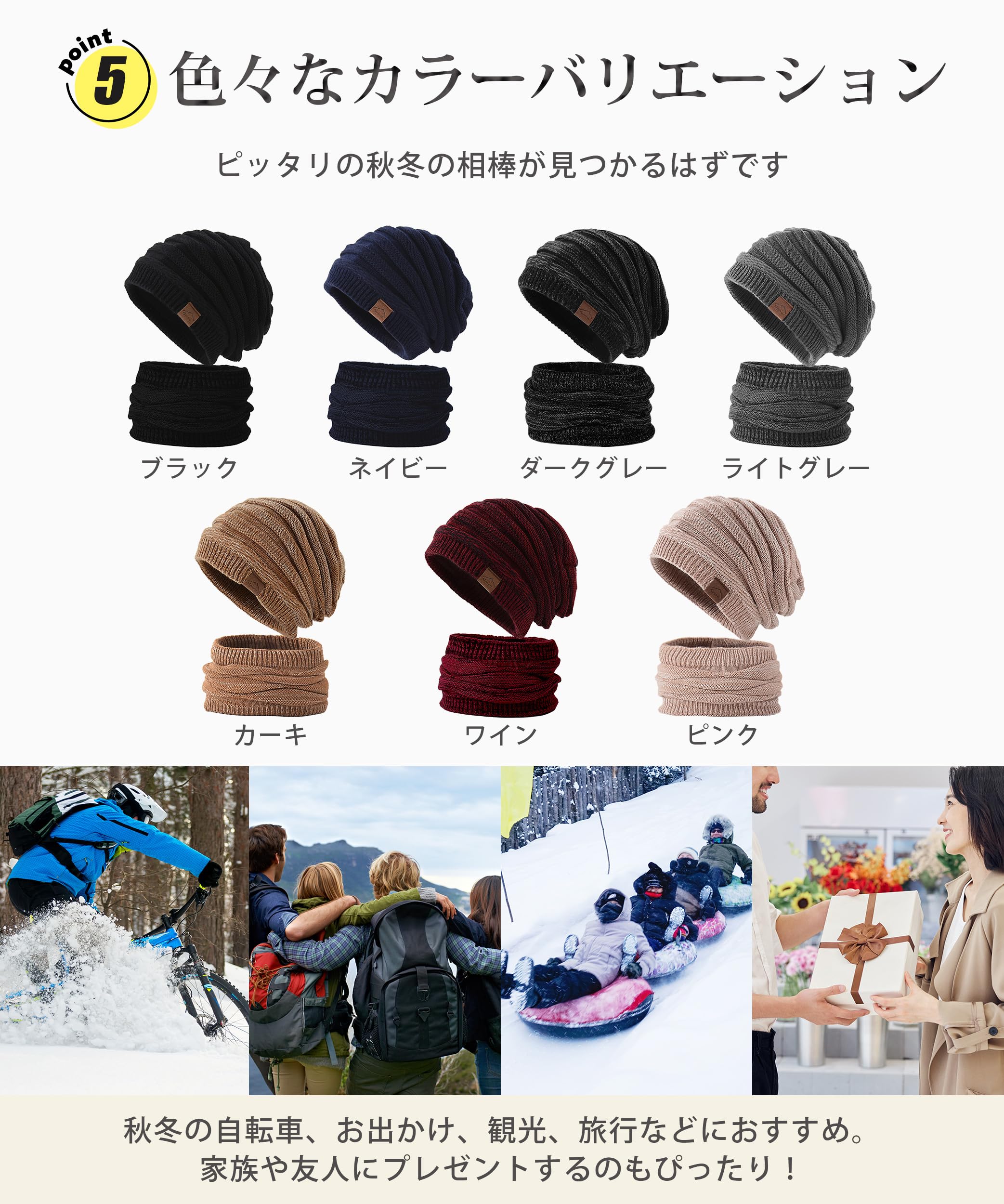 【人気のニットキャップが登場】ニット帽のみと2点セット(ニット帽とネックウォーマー)の両方のメニューをご用意し、ご使用ニーズやお好みによってご選びいただけます。この2点セットは、別々に、または組み合わせて使用することもできます。異なる場所や気温の変化に対応する柔軟性があります。カラーは7色展開と豊富に取り揃えています。帽子平置縦:29cm, 横幅:27cm, 頭周り約56-62cm。ネックウォーマー平置縦:20cm, 横幅:25cm。コーディネートしやすいシンプルなデザインで、どんなスタイルにもマッチします。