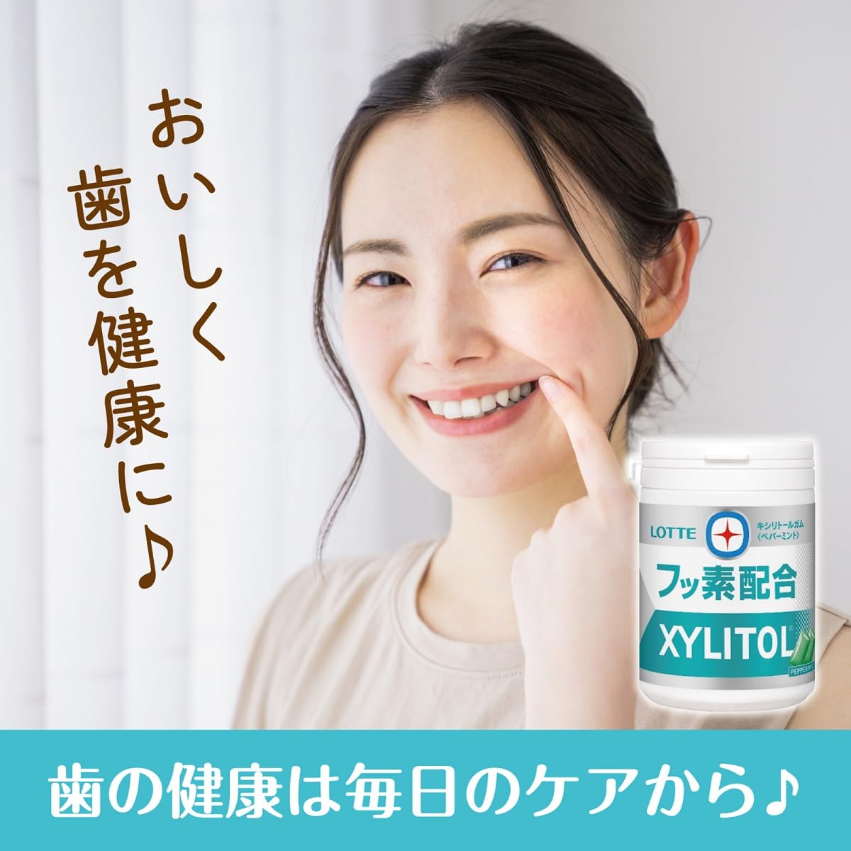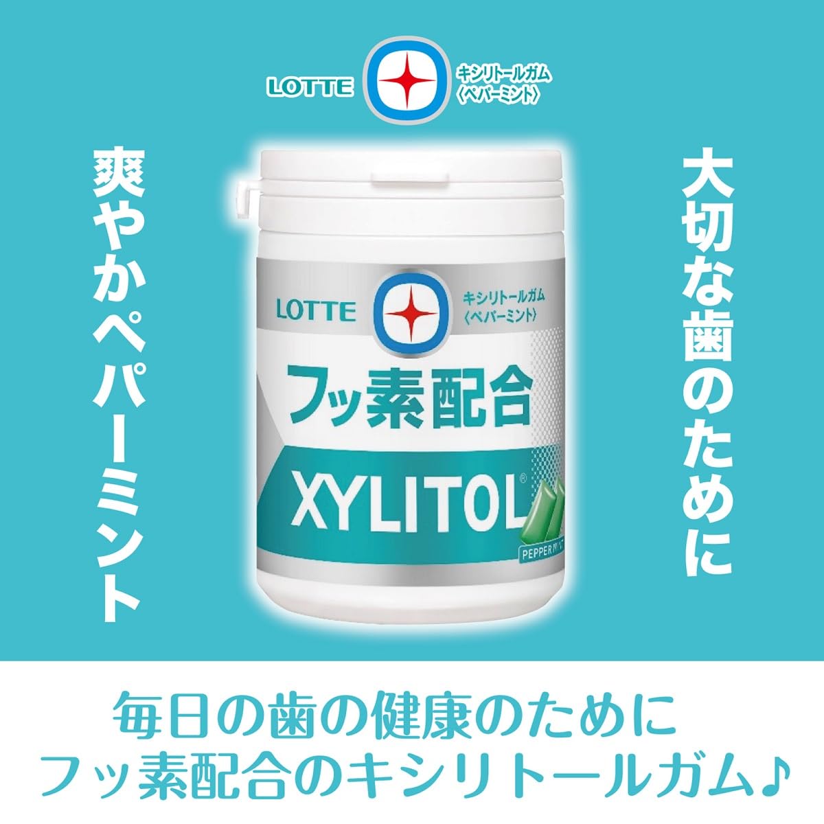 キシリトールブランドからフッ素配合商品が登場。センターガムに緑茶抽出物由来のフッ素を配合しています。ペパーミントをメインにしながら、アクセントにキレのあるスペアミントを使用することで、幅広い年代に食べやすい、コク味と爽やかさのバランスにこだわったミント香味に仕上げました。デスクや車の中でも食べるのに適したスリムボトルタイプです。大切な歯のために。