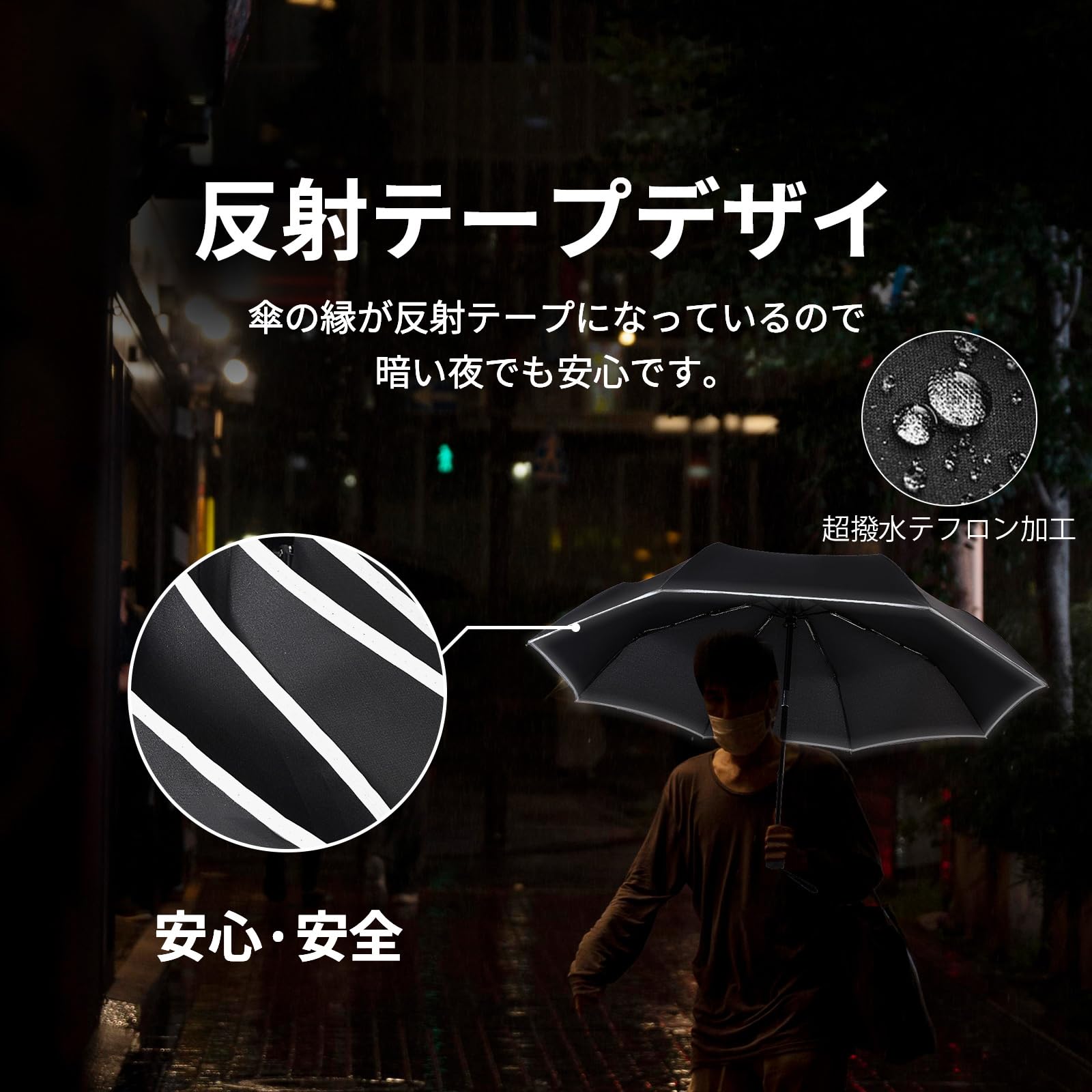 【反射テープ付き 折畳み傘 】傘のエッジ部分に反射材料で加工され、大雨の天、霧の天、雨夜でも安心安全に歩ける反射テープ付きの 折りたたみ傘 です。車からの視認性が高まり、ドライバーは夜道や雨の多い道で歩行者を見つけやすくなり、安全性が向上します。男女を問わずシンプルなデザインで、通勤や通学、夜残業の多いサラリーマンや夜に出かける方にもおすすめの おりたたみ傘