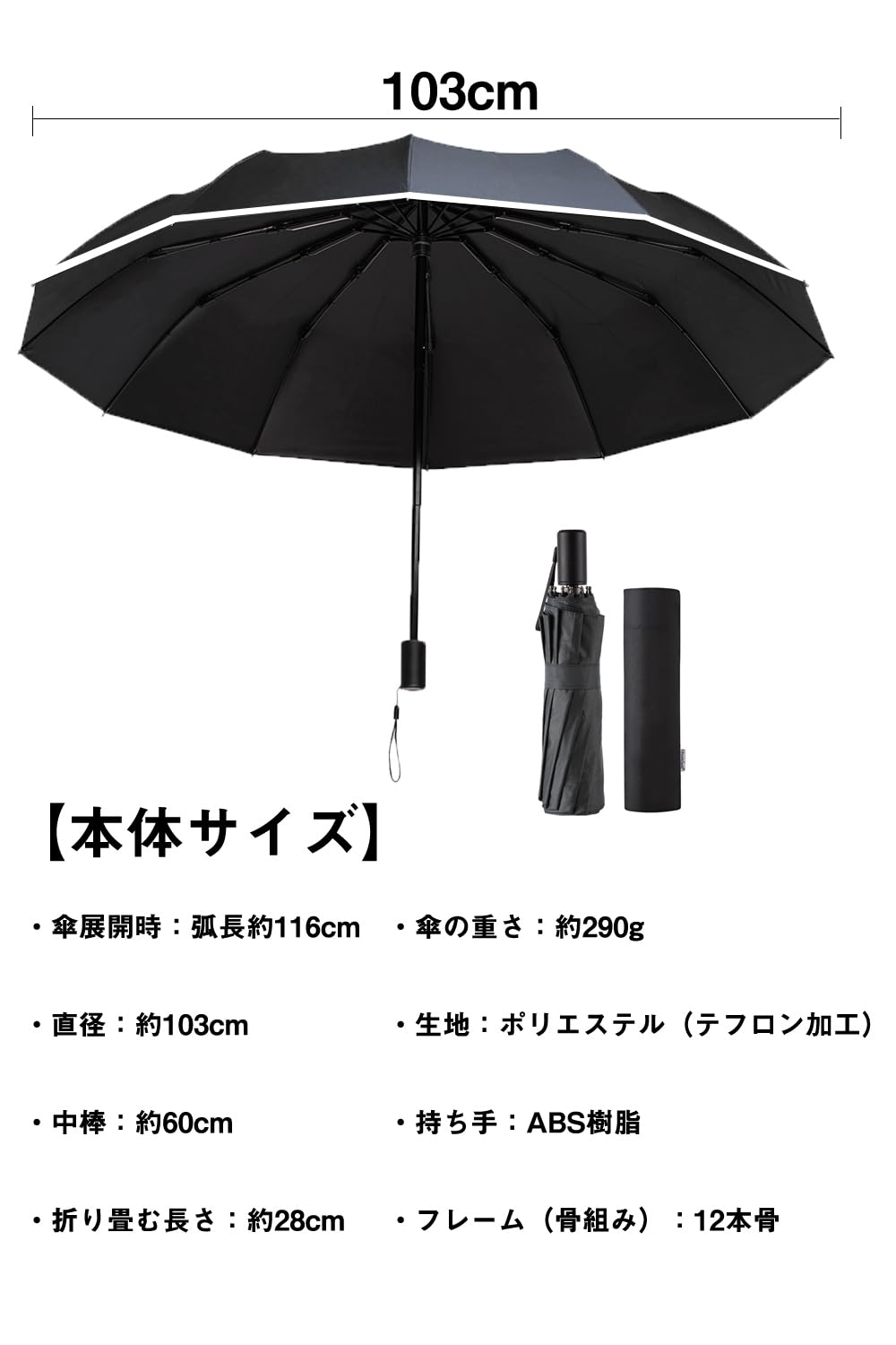 折り畳み傘 12本骨【軽量290gx直径103cmx持運びコンパクト】 折りたたみ傘 傘 高撥水 安全反射材 梅雨対策 台風対応 て丈夫なグラスファイバー骨メンズ レディース