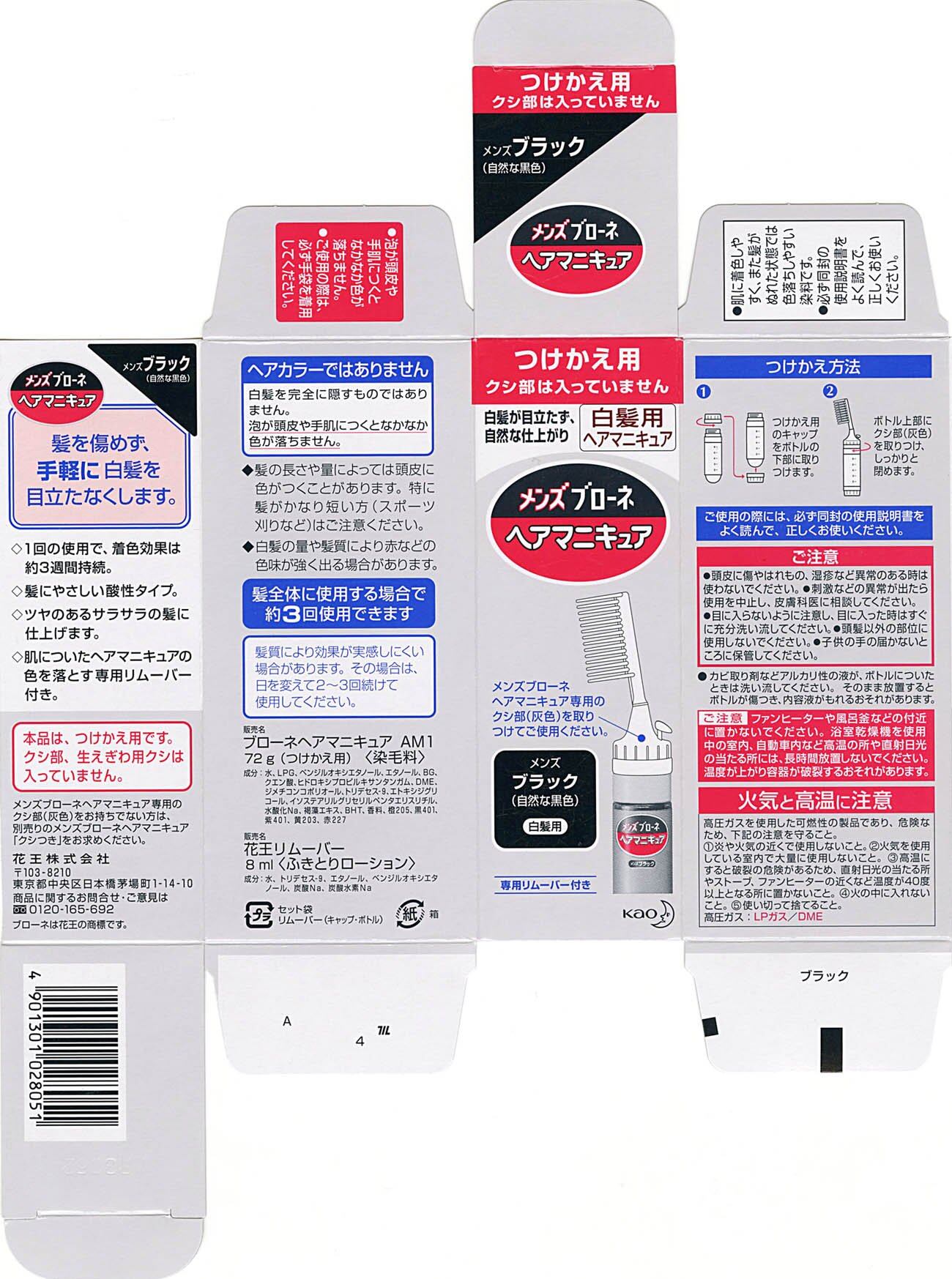 白髪の目立ちをおさえ、自然な感じに仕上がる男性用ヘアマニキュアです。 1回の使用で効果は3週間持続。髪にやさしい酸性タイプなので、髪に負担をかけません。 ツヤのあるサラサラの髪に仕上げます。(トリートメント成分/毛髪内部うるおい成分配合) つけかえ用です。専用のクシ部、生えぎわ用クシは入っていません。 ●髪全体に使用する場合で約3回使用できます ●残りは取りおきできます エアゾール製品です。お使いになる時や廃棄される時は、火気と高温にお気を付けください。 【白髪用ヘアマニキュア】 染毛料72g(つけかえ用)、専用リムーバー8ml