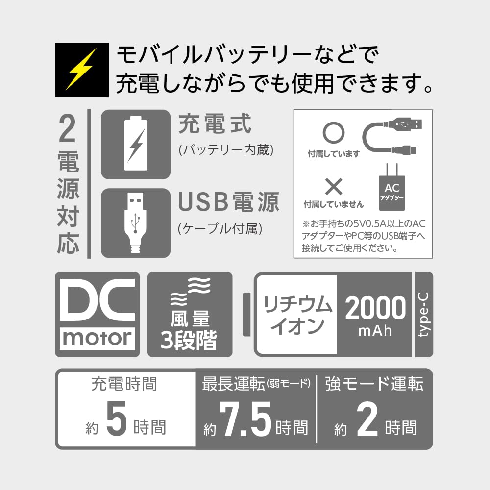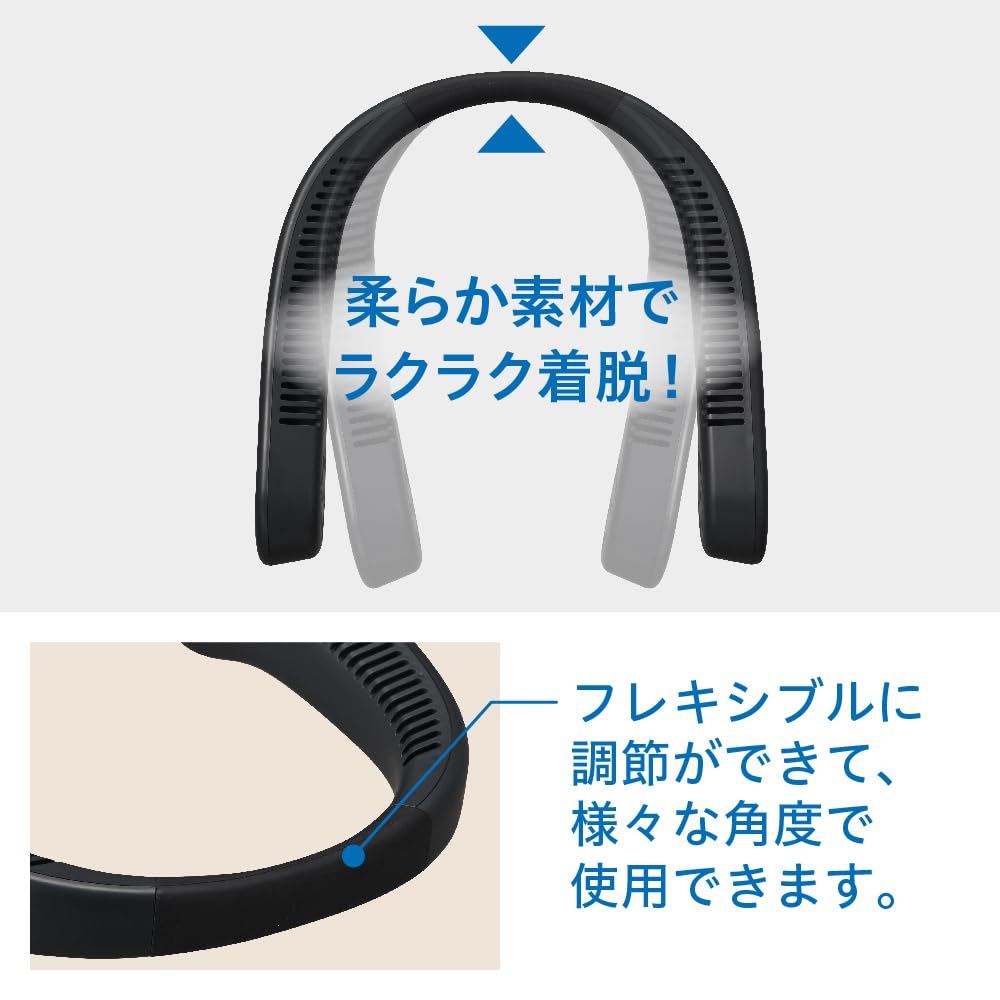 【在庫のみ】ドウシシャ スマートネックファン 2電源対応(充電式・USB電源) 風量3段階 充電時間5時間 DC ブラック