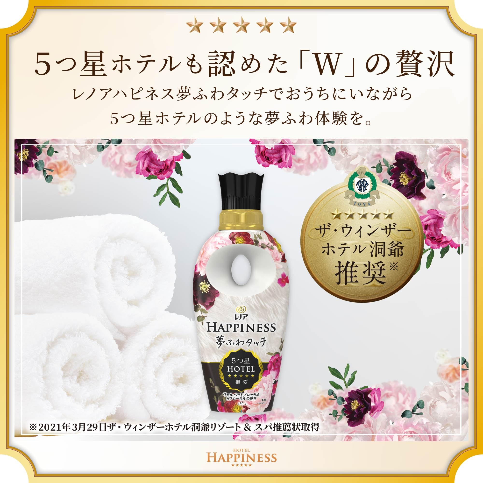 レノアハピネス夢ふわタッチは、5つ星ホテルも認めた香りも肌ざわり。レノアハピネス夢ふわタッチで、おうちにいながら5つ星ホテルの贅沢を体験してください。