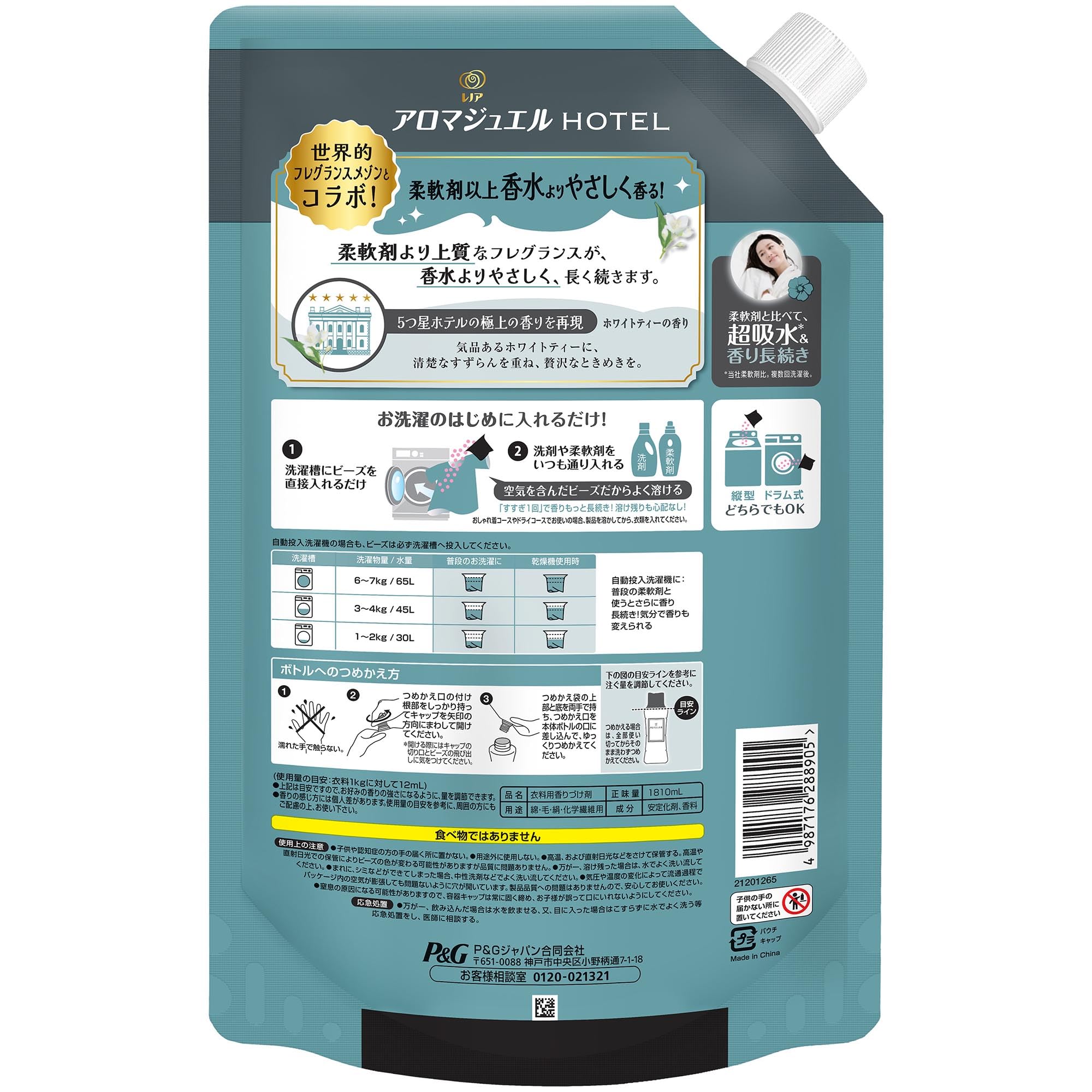 【在庫のみ】レノア ハピネス アロマジュエル HOTEL 香り付けビーズ ホワイトティーの香り 詰め替え 1810mLx4袋 [大容量] [ケース品] 柔軟剤を一緒に使って効果長続き
