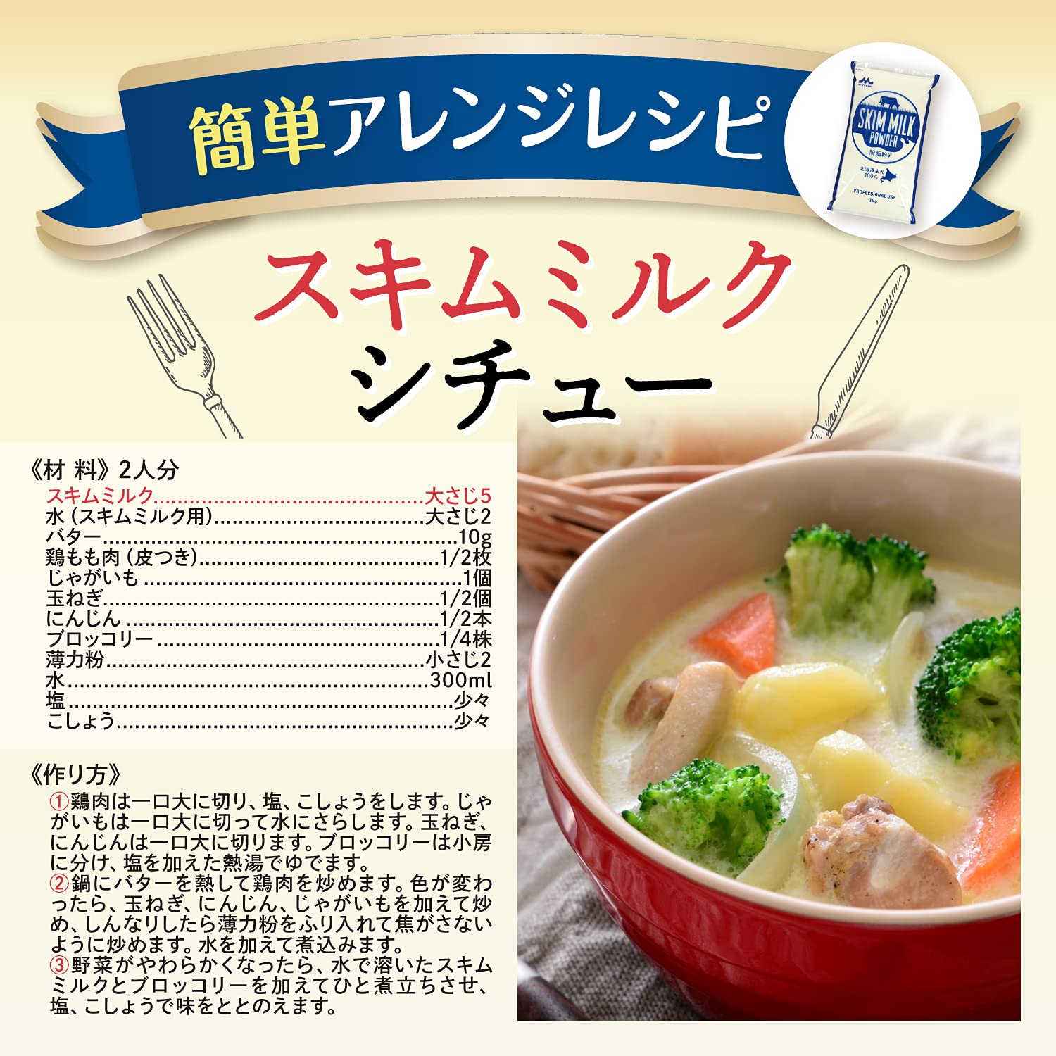 水で溶いて牛乳代わりに飲むことができます。料理やお菓子に少量混ぜるだけでも簡単においしくなります。パン作りやヨーグルトにも適しています。