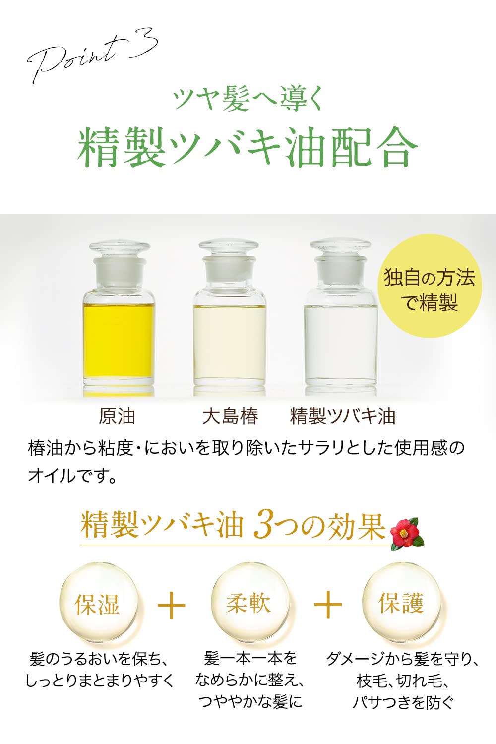 精製ツバキ油と3つの美髪成分配合でパサつき広がる髪も 、ふんわりまとまる美しい髪に導きます。