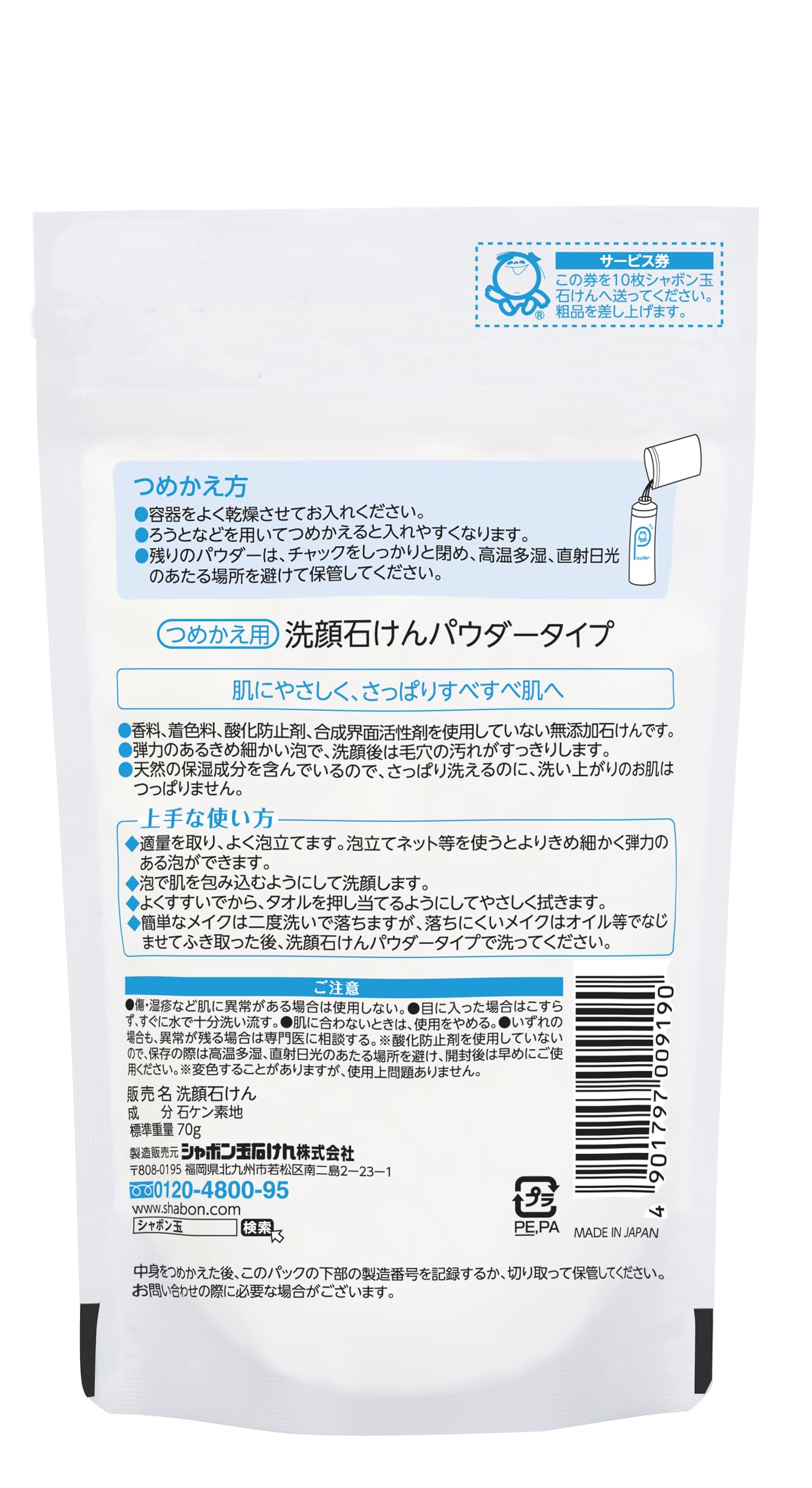 【数量限り】シャボン玉 洗顔石けんパウダータイプ つめかえ用 70g トラベル