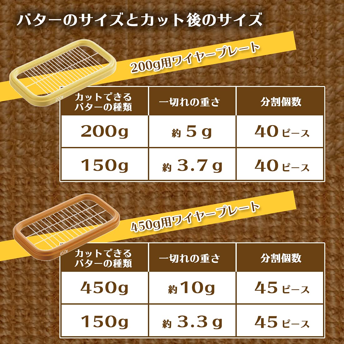 ギュッと一押しで、バターを使いやすい薄切りに簡単カット冷蔵庫にそのまま保存できる大きな業務用ポンドバター450gを約10gの薄切りに200gのバターは約5gの薄切りにホームベーカリーや料理、おかし作りに。計量しやすく便利パンケーキやトーストにのせて、溶けやすい より ●ギュッとひと押しで、市販の200gのバターを約5gの薄切りにカットできる●定量に切れるのでお菓子作りやホームベーカリーに便利●450gの大きめサイズのバターも10gづつのブロックにカットできる●自動食器洗浄機可●製造は金型、製造、加工、包装までを自社工場で一貫して行う、新潟県燕市の曙産業 原材料・成分 バターケース (本体)/AS(アクリロニトリル・スチレン)樹脂 (耐熱温度70度/耐冷温度-30度)・フタ/ポリエチレン (耐熱温度80度/耐冷温度-30度)・ワイヤープレート枠/ABS(アクリロニトリル・ブタジエン・スチレン)樹脂 (耐熱温度80度/耐冷温度-30度)・ワイヤー/18-8ステンレススチール 続きを見る