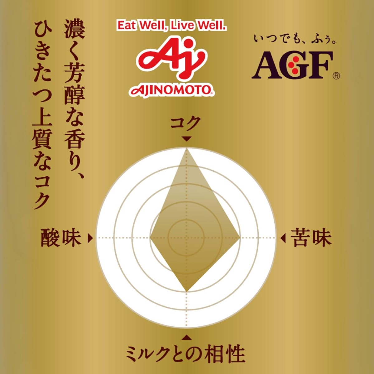 香り引き出す、じっくり焙煎。「ちょっと贅沢な珈琲店」レギュラー・コーヒーは、厳選した豆の特徴に合わせて、AGF独自の「T2ACMI焙煎」技術により、丁寧に焙煎した豊かなコクと深く濃い香り。豆のコクと香りを最大限に引き出し、雑味のない味わいに仕上げています。珈琲店のマスターがハンドドリップで淹れたような贅を尽くした奥深い味わいと香りが楽しめるレギュラーコーヒー粉です。