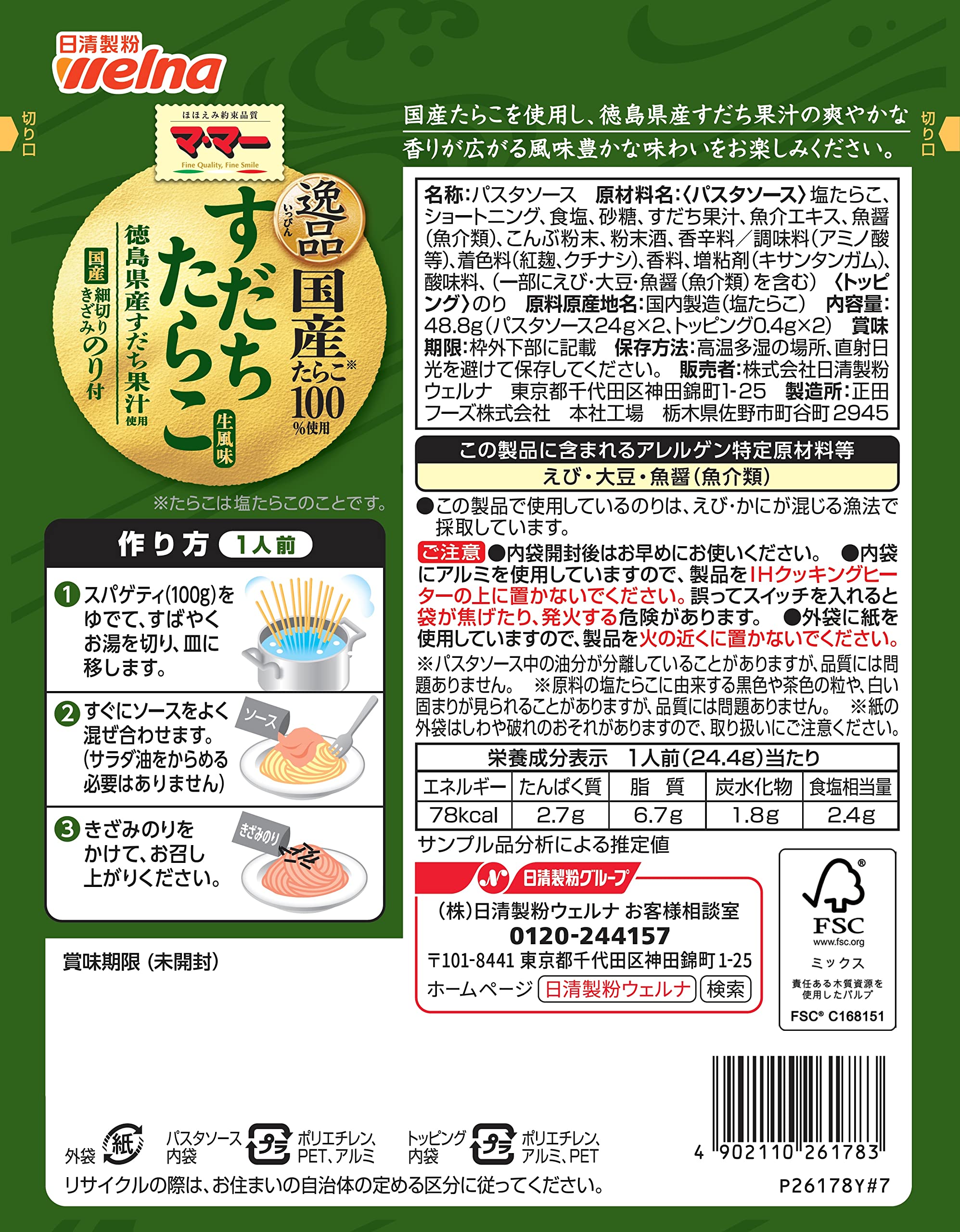 【パスタソース】塩たらこ、ショートニング、食塩、砂糖、すだち果汁、魚介エキス、魚?(魚介類)、こんぶ粉末、粉末酒、香辛料/調味料(アミノ酸等)、着色料(紅?、クチナシ)、香料、増粘剤(キサンタンガム)、酸味料、(一部にえび、大豆、魚醤(魚介類)を含む) 【トッピング】のり【原料原産地名】国内製造(塩たらこ)