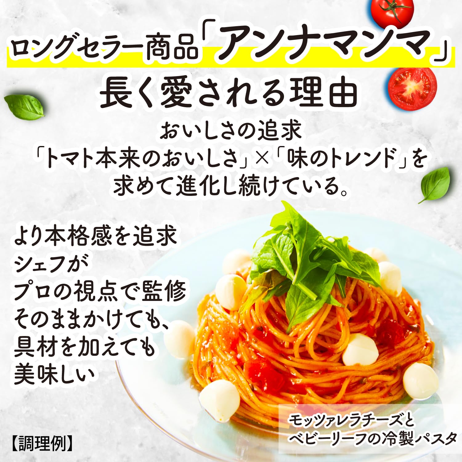 加熱時間の少ない製法で完熟トマトの風味と鮮やかな色合いを活かした、果肉感がたっぷりなパスタソースです。