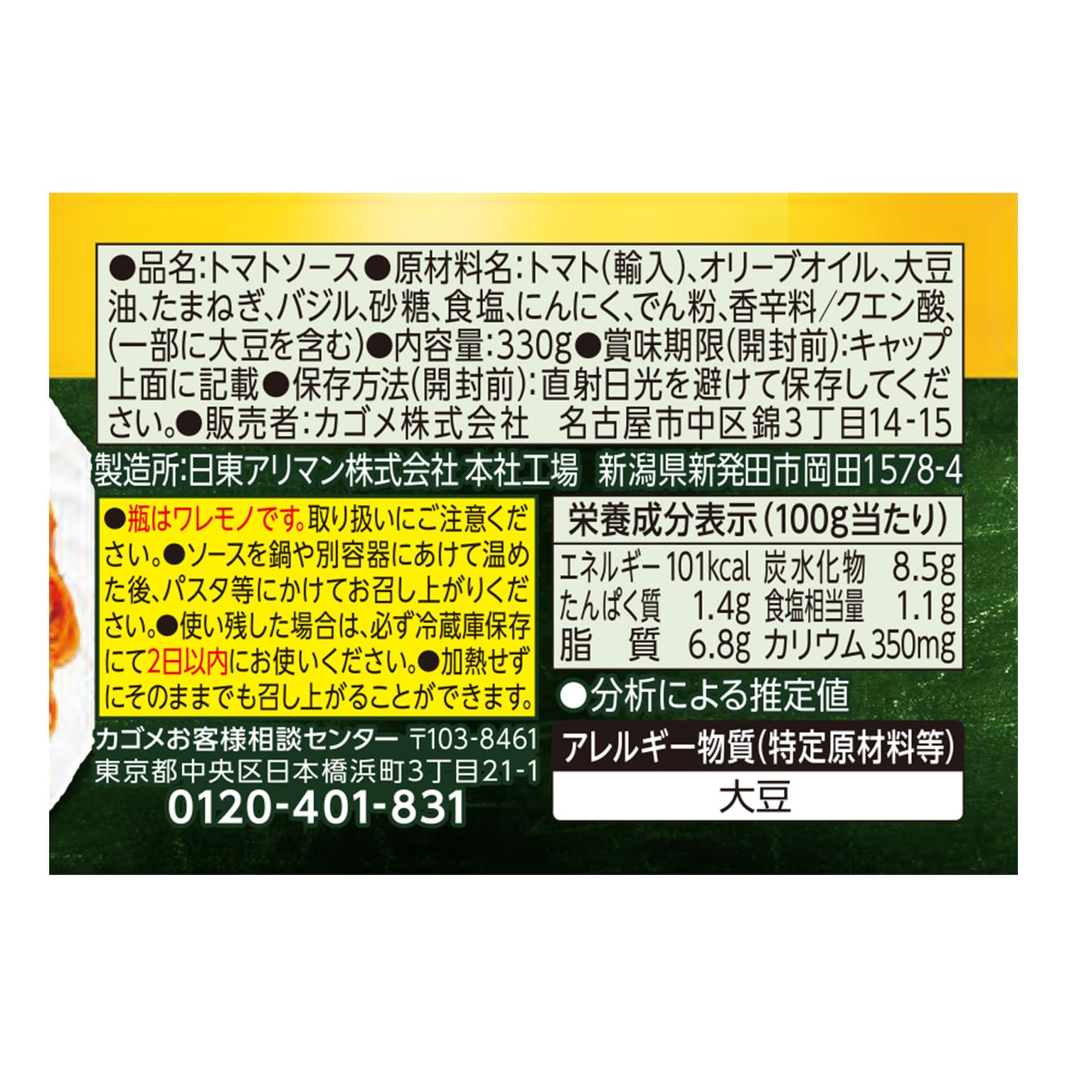 トマト(輸入)、食用植物油脂(オリーブオイル、大豆油)、たまねぎ、バジル、にんにく、食塩、でん粉、香辛料/クエン酸、(一部に大豆を含む)