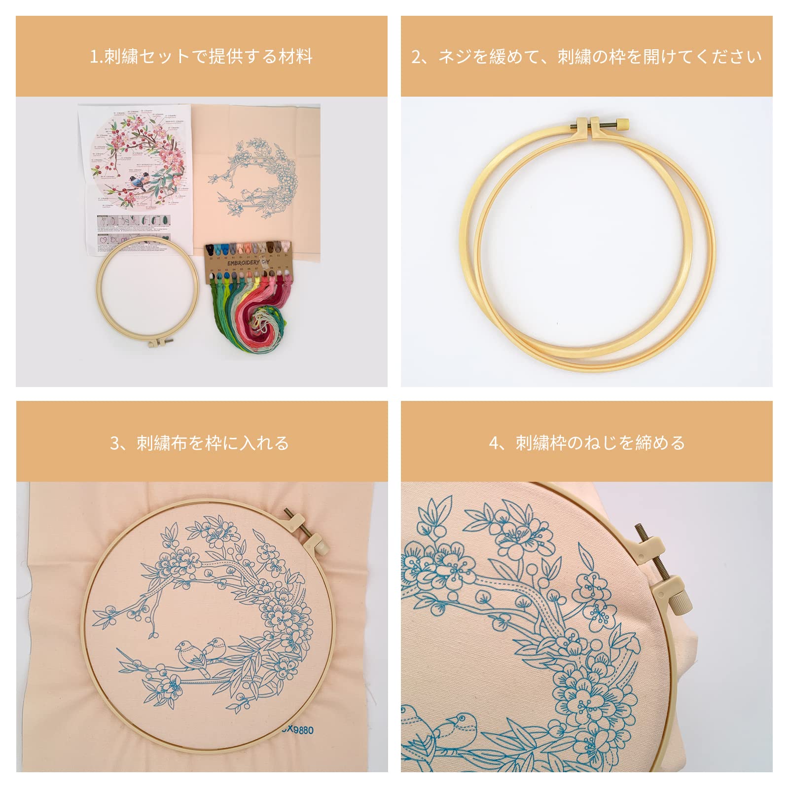 ?[素材]:布生地:綿麻、糸:繊細綿。刺繍枠には調整ネジが付いており、必要に応じて締め付けることができ、生地をドラムのようにしっかりと生地をキープできます。