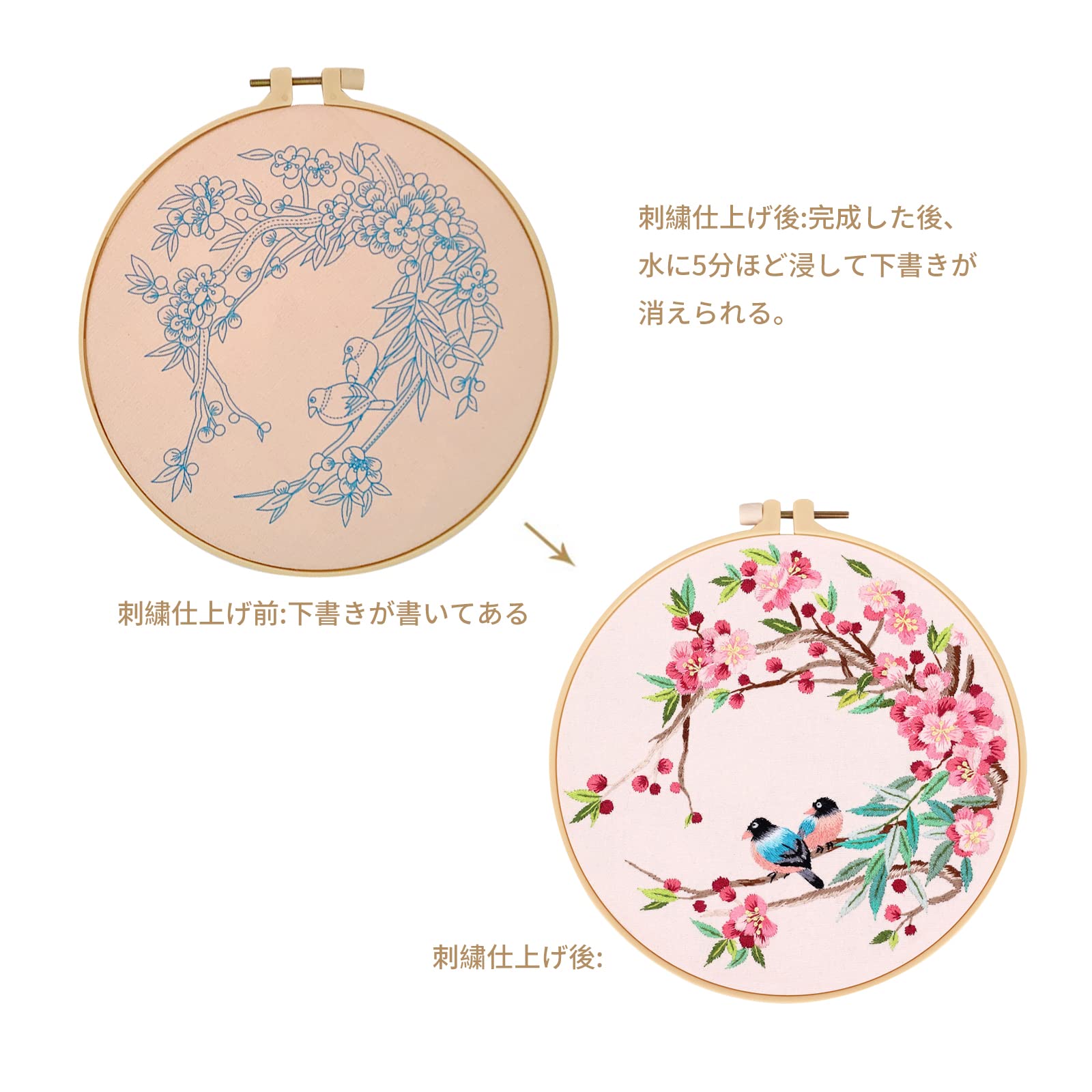 ?[初心者さんでも]:必要な刺繍用ものがすべてセットに含まっており、専門者はもちろん、初心者でも説明書に従って、素敵な刺繍を仕上げることができます。【ご注意:完成品は画像に示されています。完成した後、水に5分ほど浸して、下書きが消えられます。】