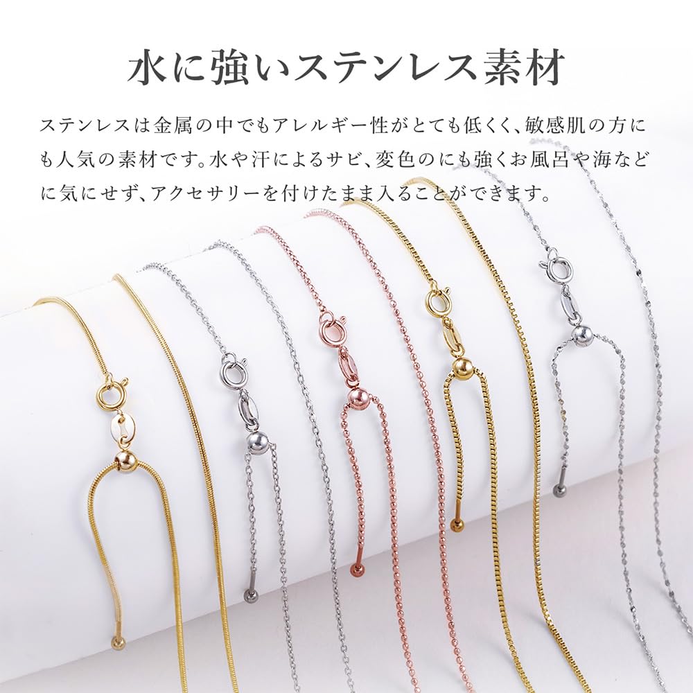 【バリエーション豊富】チェーンの種類がスネークチェーン、あずきチェーン、ボックスチェーン、ボールチェーン、満点星チェーンの5種類、カラーがシルバー、ゴールドの2色の計10種類からお選びいただけますので貴方のお気に入りがきっと見つかります。シンプルに着用したり、お手持ちのチャームなどと合わせてみたりとお好みのスタイルでお楽しみいただけます。 【長さが自由に調節可能なアジャスター付き】 アジャスターで長さを自由に調節可能(30cm、35cm、40cm、45cm)